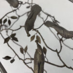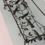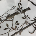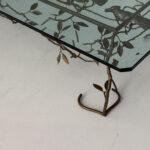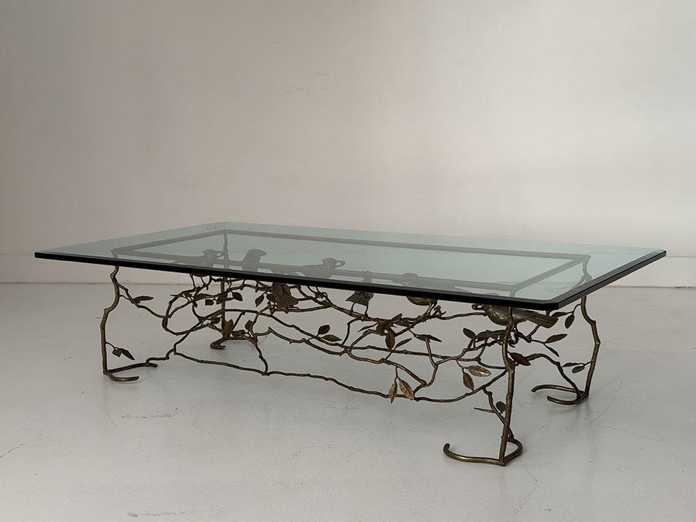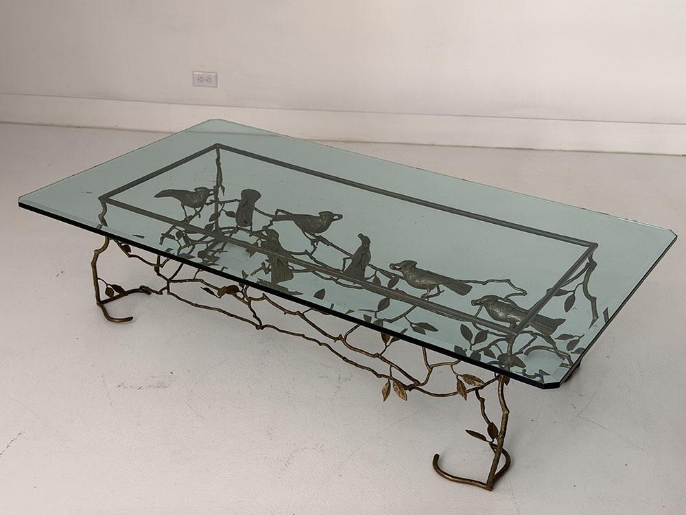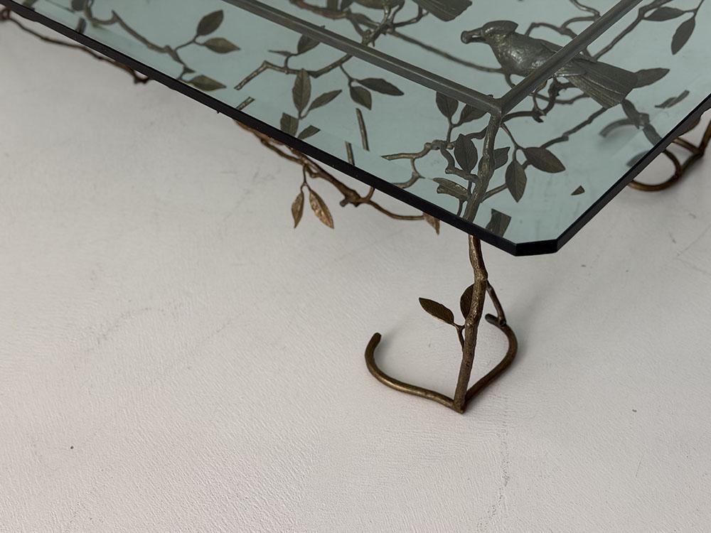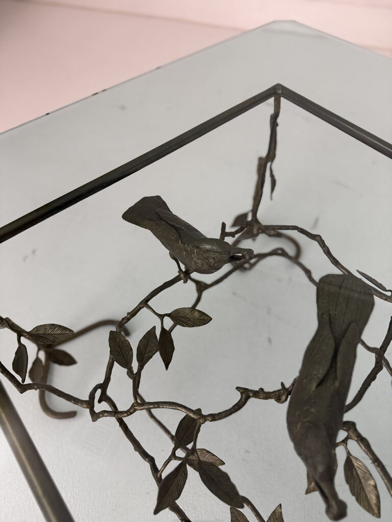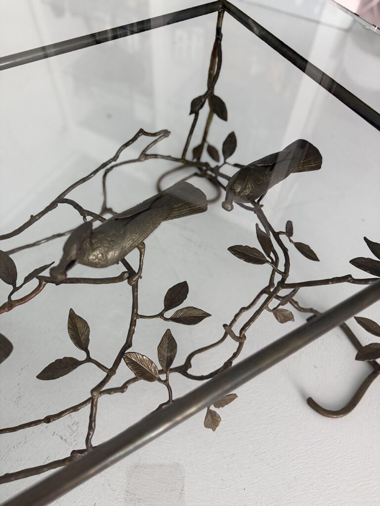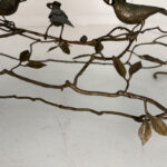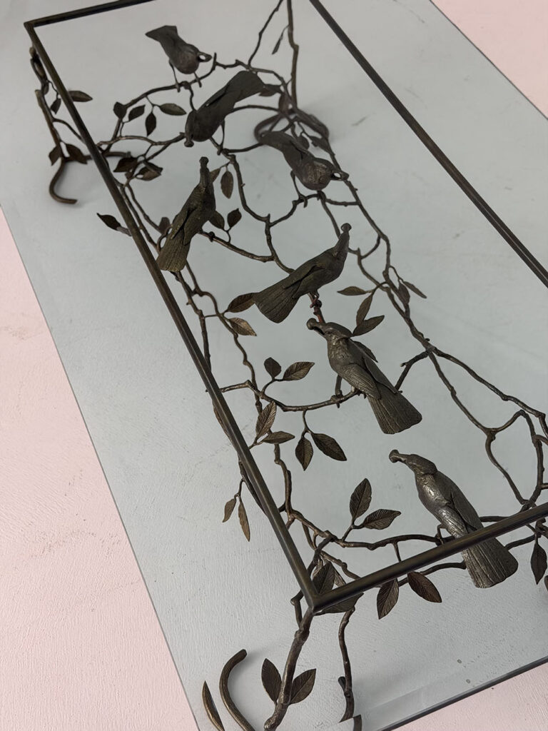 An exceptional Italian cast brass cocktail table from the 1970s, featuring an intricate sculptural base of entwined branches with perched birds and leaves, all rendered in finely detailed brass. The birds appear to be Jay birds and all sport a berry in their beaks. The naturalistic form evokes the organic design sensibilities of mid-century Italian decorative arts, balancing whimsy with sophistication. A rectangular half inch glass top with notched corners is enhanced with a one inch bevel and rests gracefully on the sculptural frame, offering a clear view of the exquisite casting below.