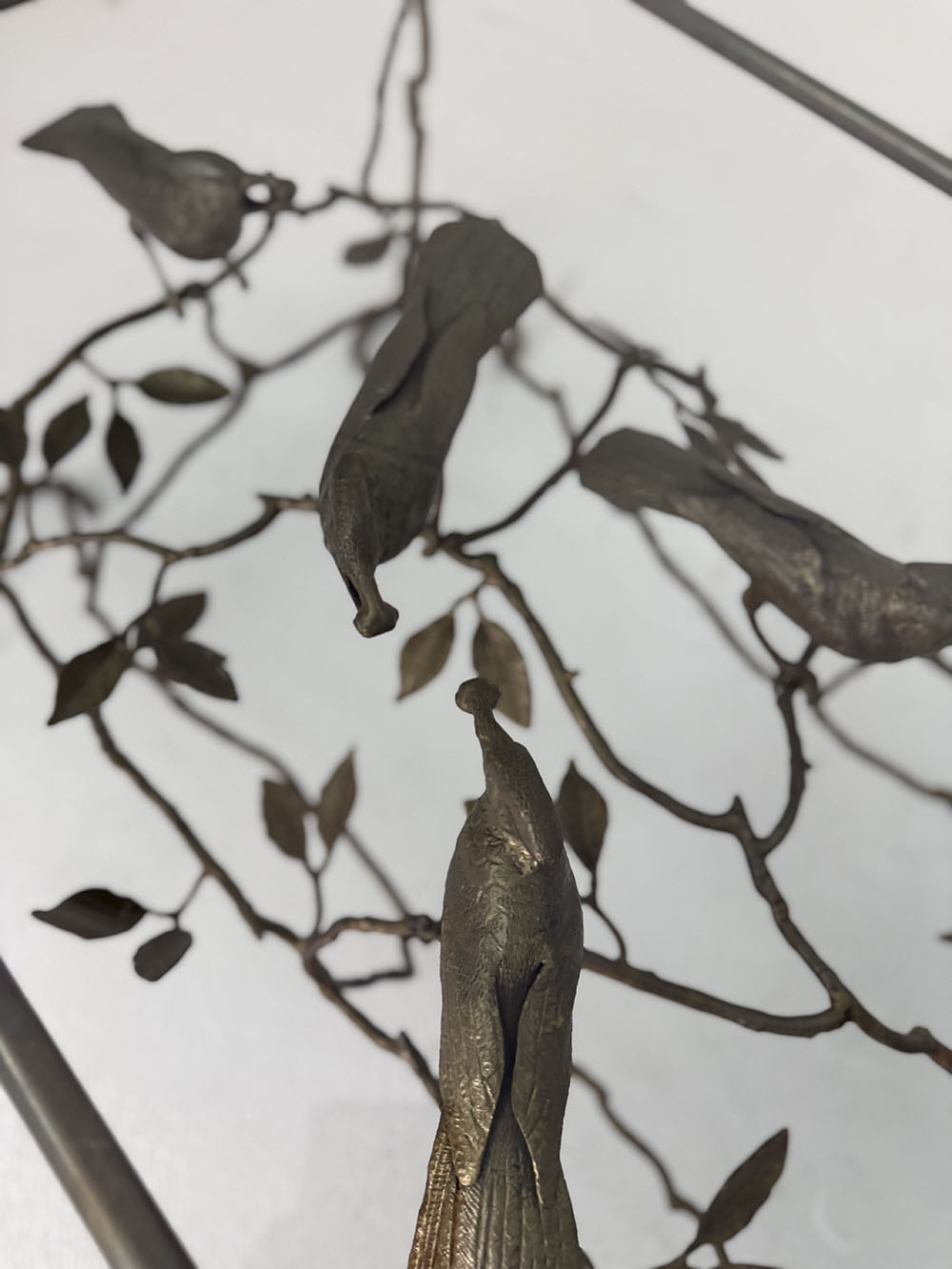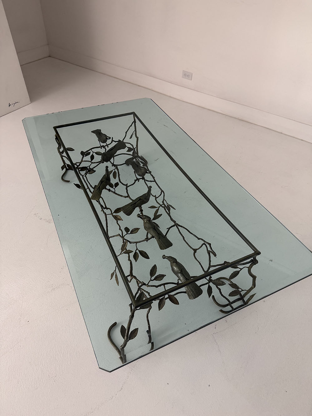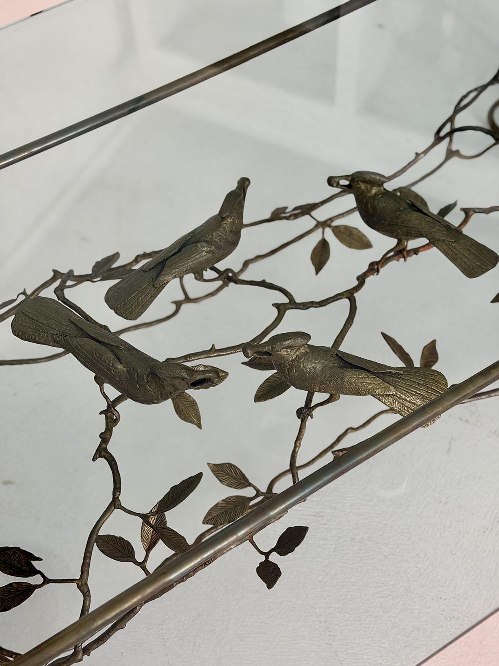 An exceptional Italian cast brass cocktail table from the 1970s, featuring an intricate sculptural base of entwined branches with perched birds and leaves, all rendered in finely detailed brass. The birds appear to be Jay birds and all sport a berry in their beaks. The naturalistic form evokes the organic design sensibilities of mid-century Italian decorative arts, balancing whimsy with sophistication. A rectangular half inch glass top with notched corners is enhanced with a one inch bevel and rests gracefully on the sculptural frame, offering a clear view of the exquisite casting below.