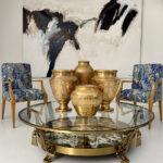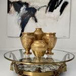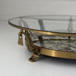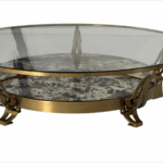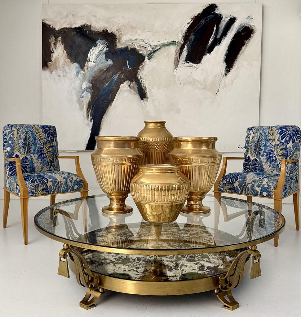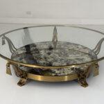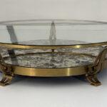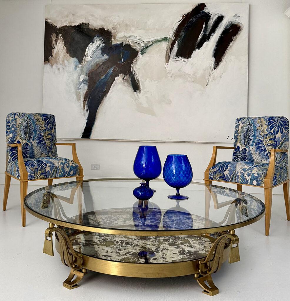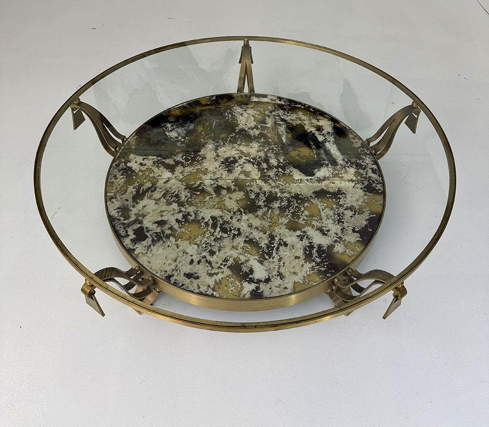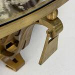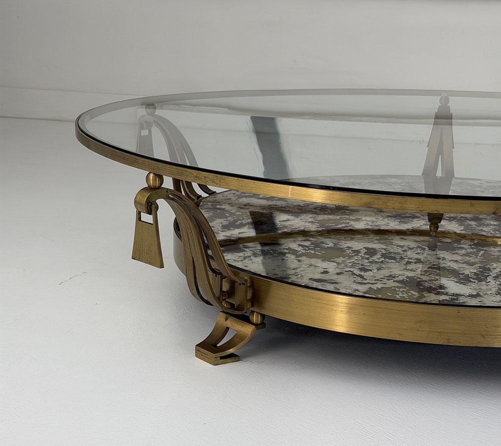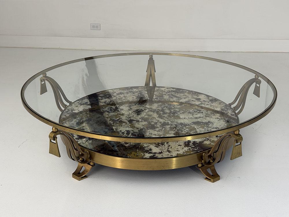 A floating circular glass top rests above an antiqued mirrored lower tier, which adds depth and a subtle reflective shimmer, beautifully complementing the warm brass tones. The combination of materials and proportion reflects Pani’s ability to merge architectural precision with opulent detail, hallmarks of his work for Mexico’s elite interiors. This example just under five feet in circumference is quite large and takes presence in any room. This Arturo Pani gilt brass circular cocktail table would add a level of luxury design to any interior.