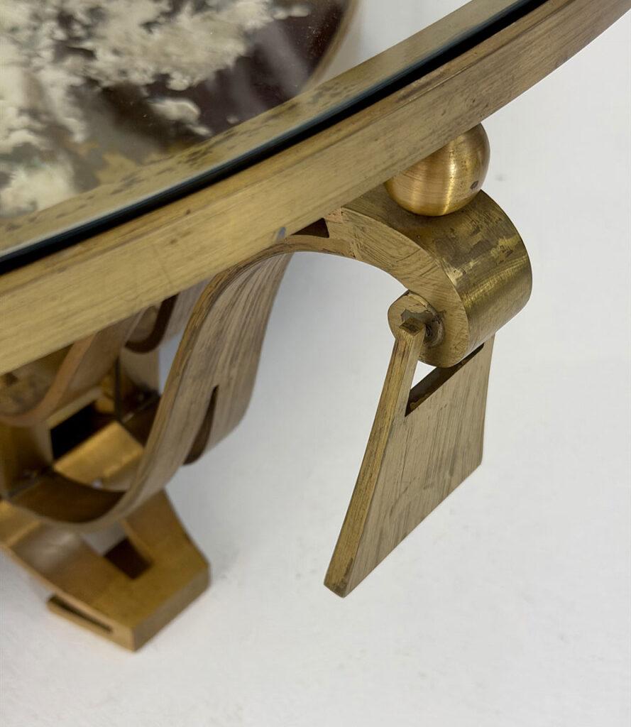 An exceptional Arturo Pani gilt brass circular cocktail table made in Mexico City, circa 1950s. This finely detailed design exemplifies Pani’s distinctive interpretation of Hollywood Regency elegance filtered through Mexican Modernism. The table features a substantial gilt-brass frame with sweeping sculptural supports that terminate in stylized looped feet and tassel-like finials, lending a sense of movement and refinement.