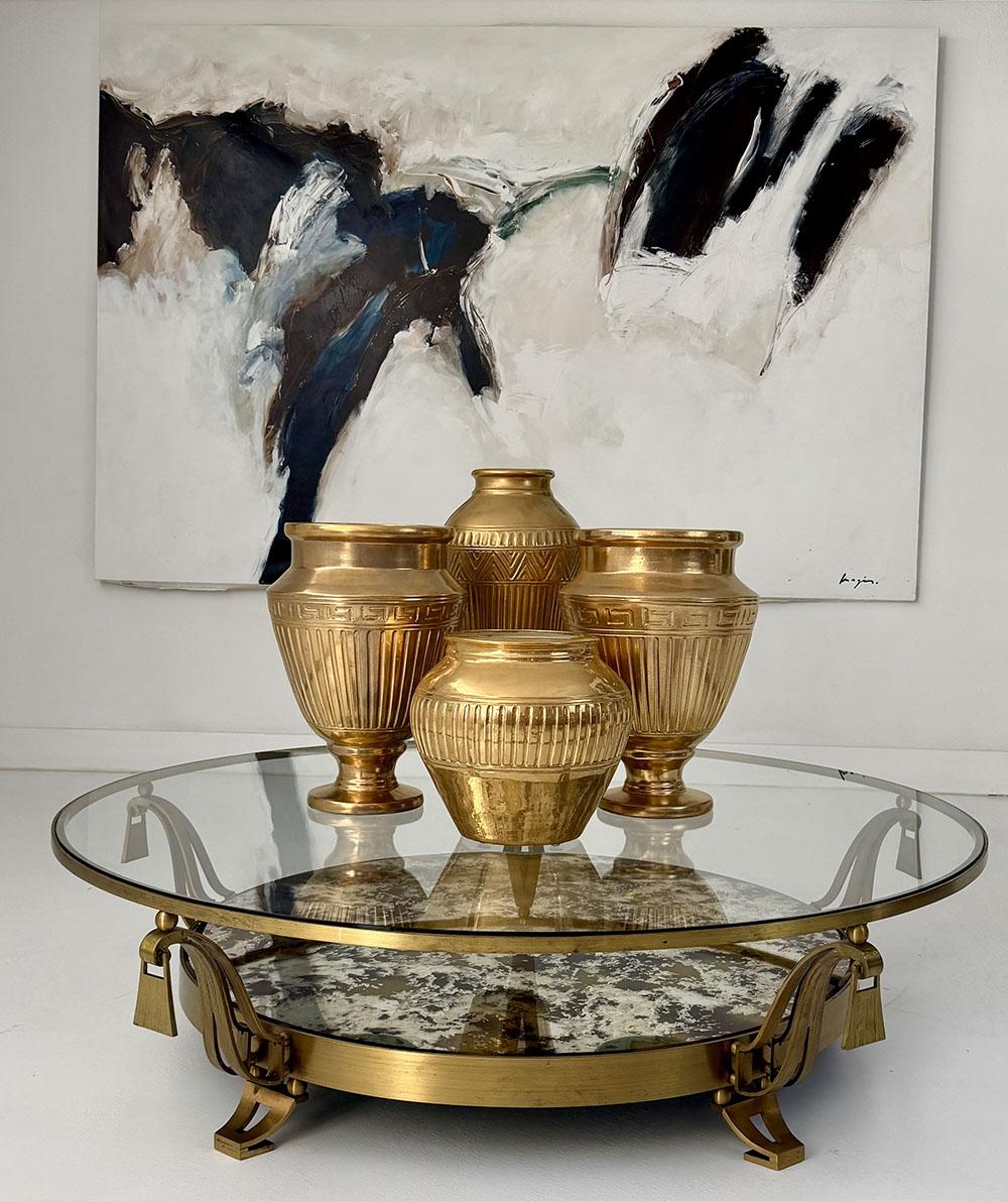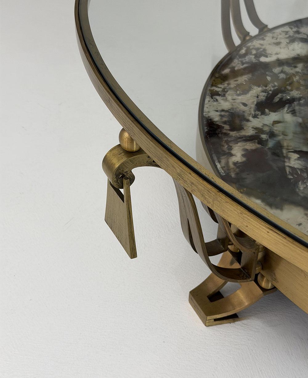 A floating circular glass top rests above an antiqued mirrored lower tier, which adds depth and a subtle reflective shimmer, beautifully complementing the warm brass tones. The combination of materials and proportion reflects Pani’s ability to merge architectural precision with opulent detail, hallmarks of his work for Mexico’s elite interiors. This example just under five feet in circumference is quite large and takes presence in any room. This Arturo Pani gilt brass circular cocktail table would add a level of luxury design to any interior.