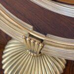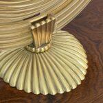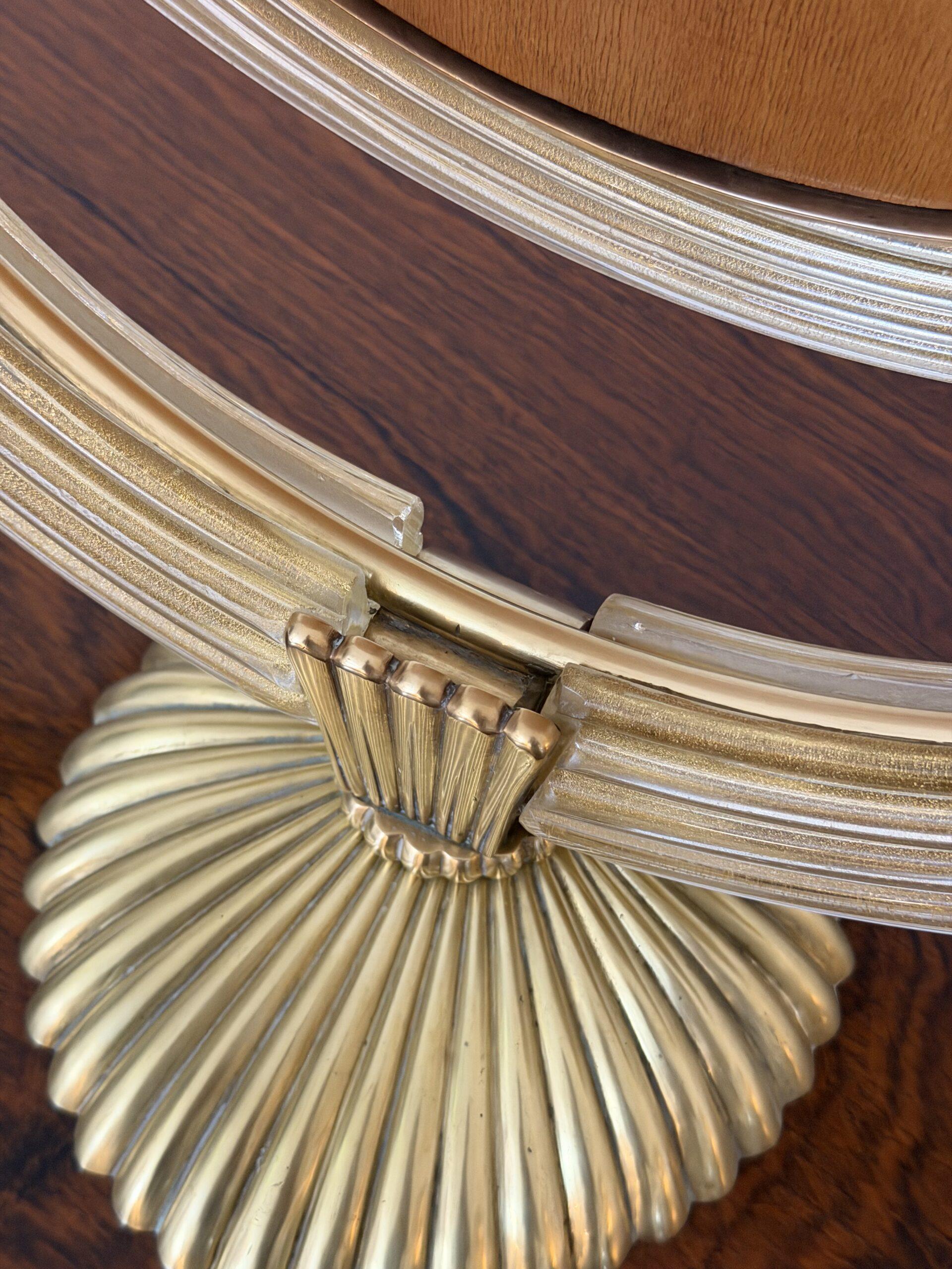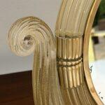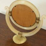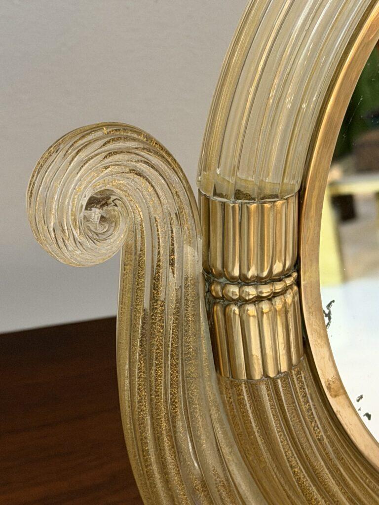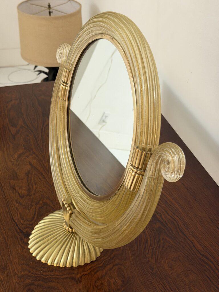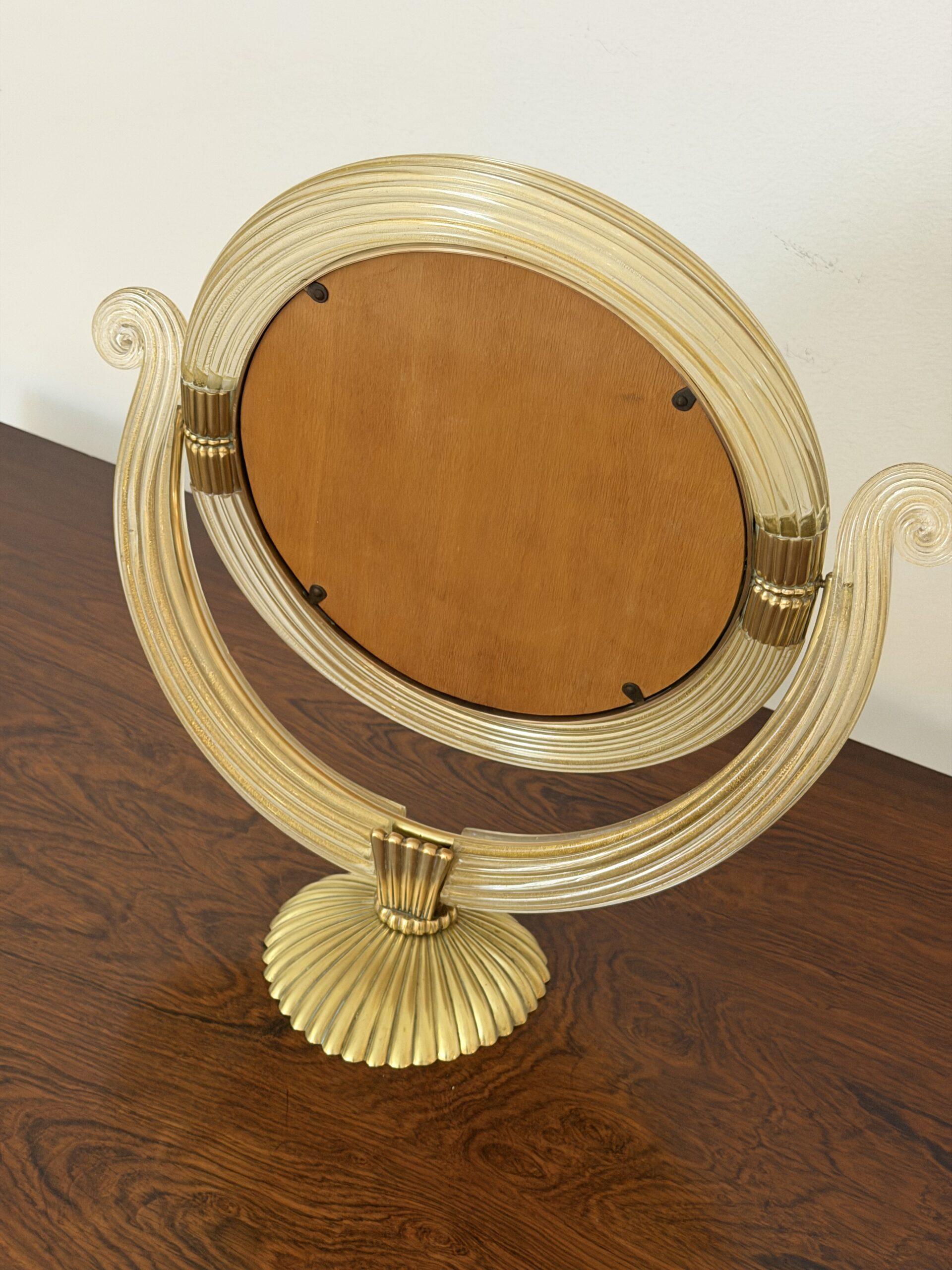 The glass elements are mounted with finely cast gilt brass fittings, including reeded accents and a scalloped brass base, reflecting the refined craftsmanship and classical sensibility for which Barovier is celebrated. The mirror is slightly adjustable and rests securely on its original base, making it ideal for use as a vanity, dressing table, or decorative accent mirror.