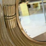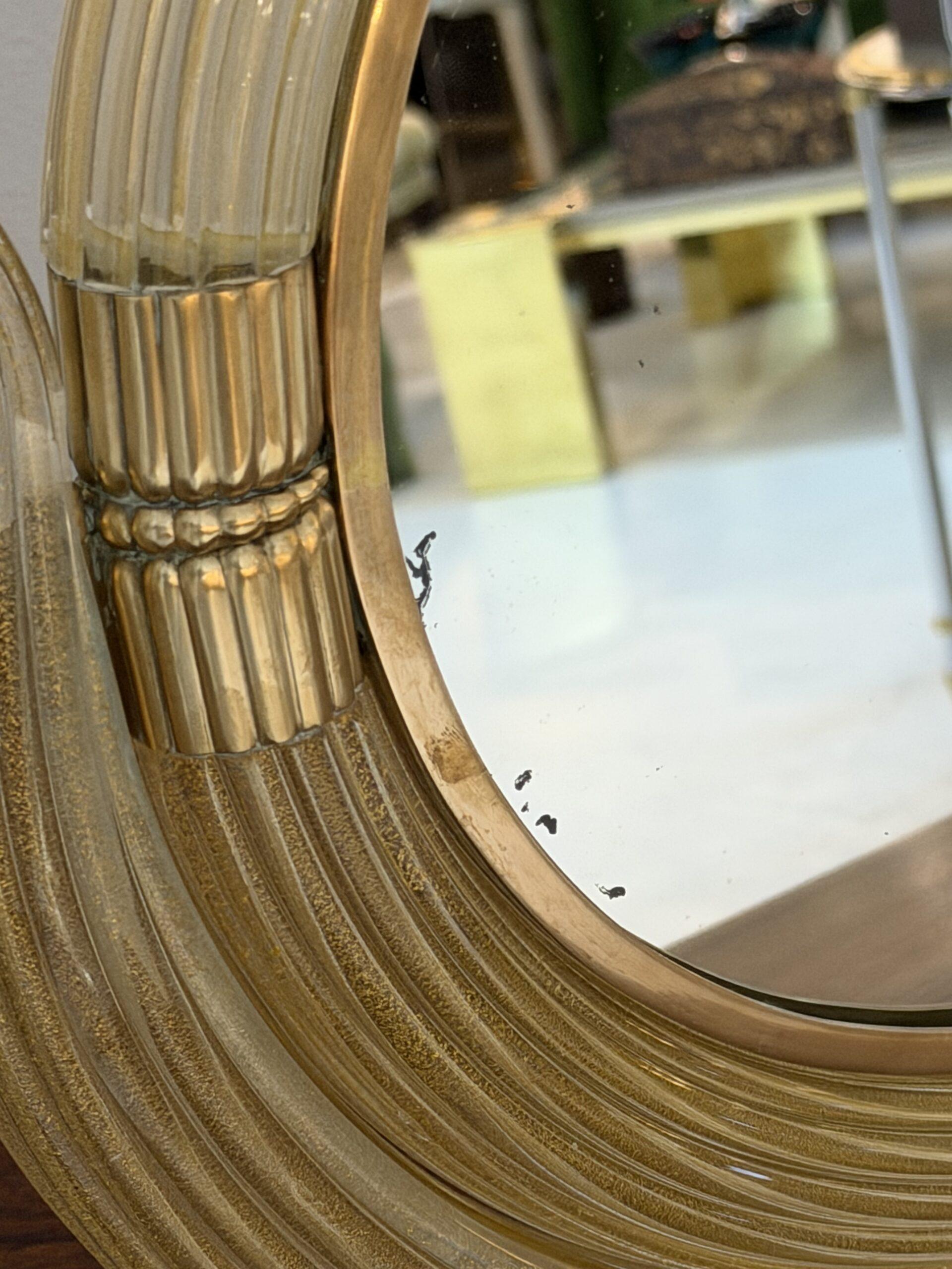 A refined and sculptural Barovier Murano Glass vanity mirror, Italy, circa 1930s, executed in ribbed, hand-formed Murano glass with warm champagne undertones enhanced by the addition of gold inclusions. The circular mirror plate is framed by concentric arcs of deeply fluted glass, terminating in elegant opposing scrolls that lend the piece a distinctly architectural yet lyrical presence.