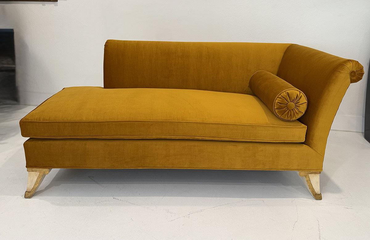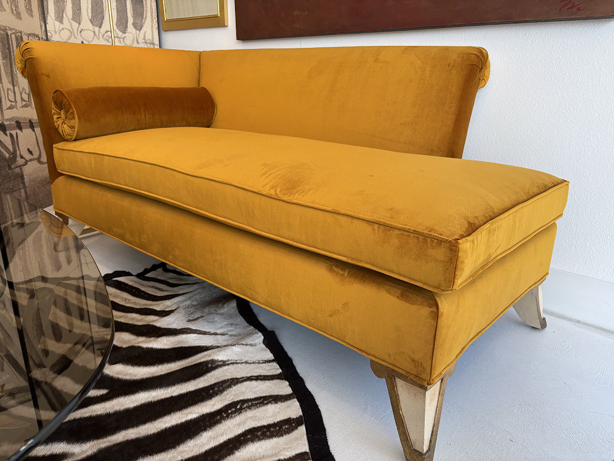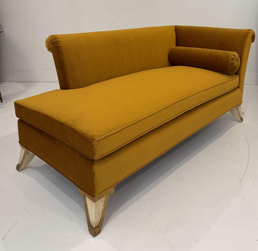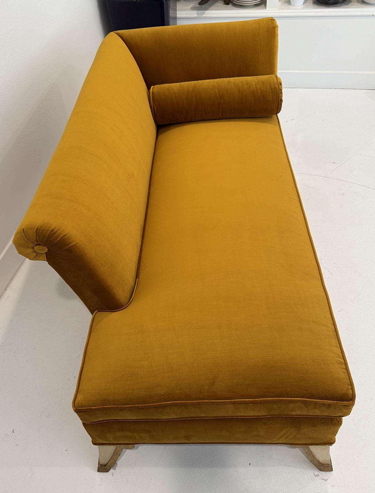 A striking and luxurious pair of custom méridienne chaises by George Doan, newly upholstered and sourced directly from the designer’s personal collection. The tailored silhouettes evoke classic French daybeds, reimagined through Doan’s refined, contemporary lens. Upholstered in a rich ochre velvet, the sofas are accented by dramatic scroll arms, crisp lines, and pale wood saber legs with subtle distressing and gold leafed details. Each piece features a left or right arm configuration for versatile placement in a mirrored arrangement or as stand-alone statement pieces.