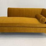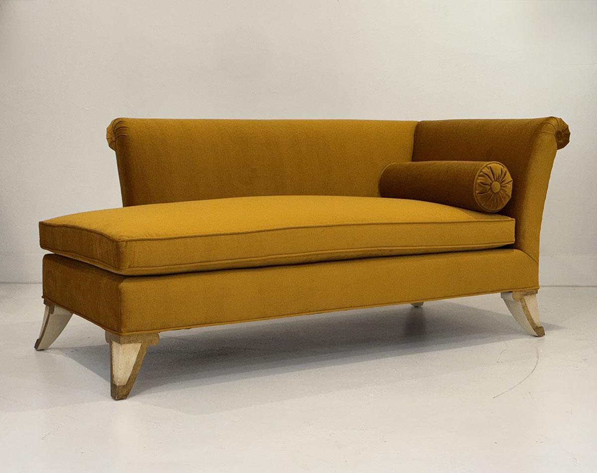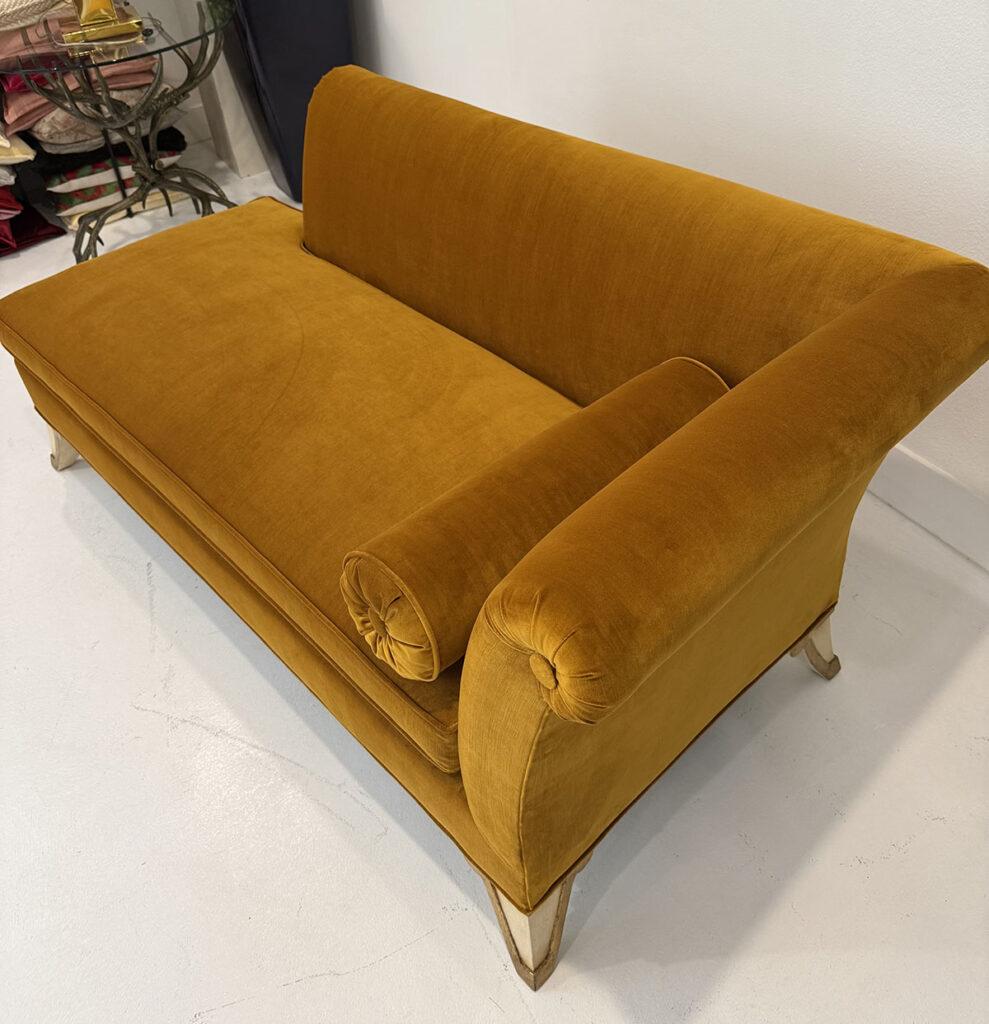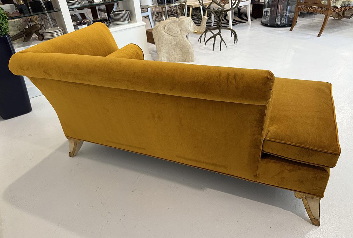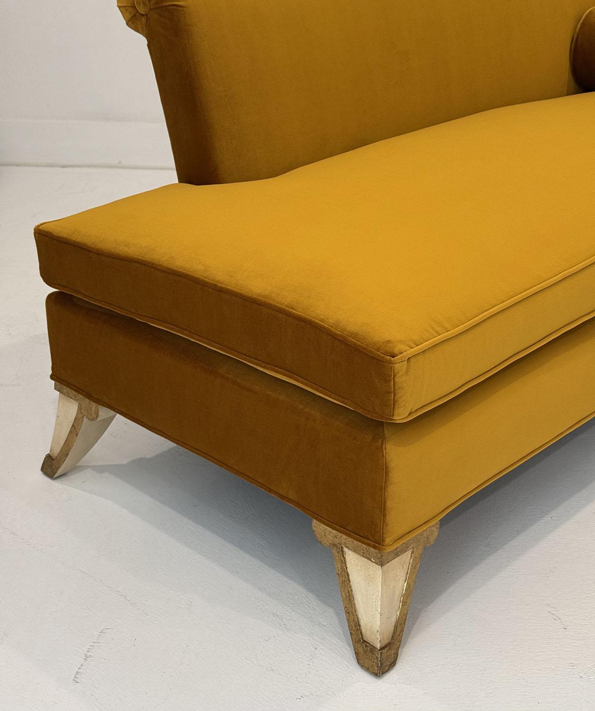 A striking and luxurious pair of custom méridienne chaises by George Doan, newly upholstered and sourced directly from the designer’s personal collection. The tailored silhouettes evoke classic French daybeds, reimagined through Doan’s refined, contemporary lens. Upholstered in a rich ochre velvet, the sofas are accented by dramatic scroll arms, crisp lines, and pale wood saber legs with subtle distressing and gold leafed details. Each piece features a left or right arm configuration for versatile placement in a mirrored arrangement or as stand-alone statement pieces.