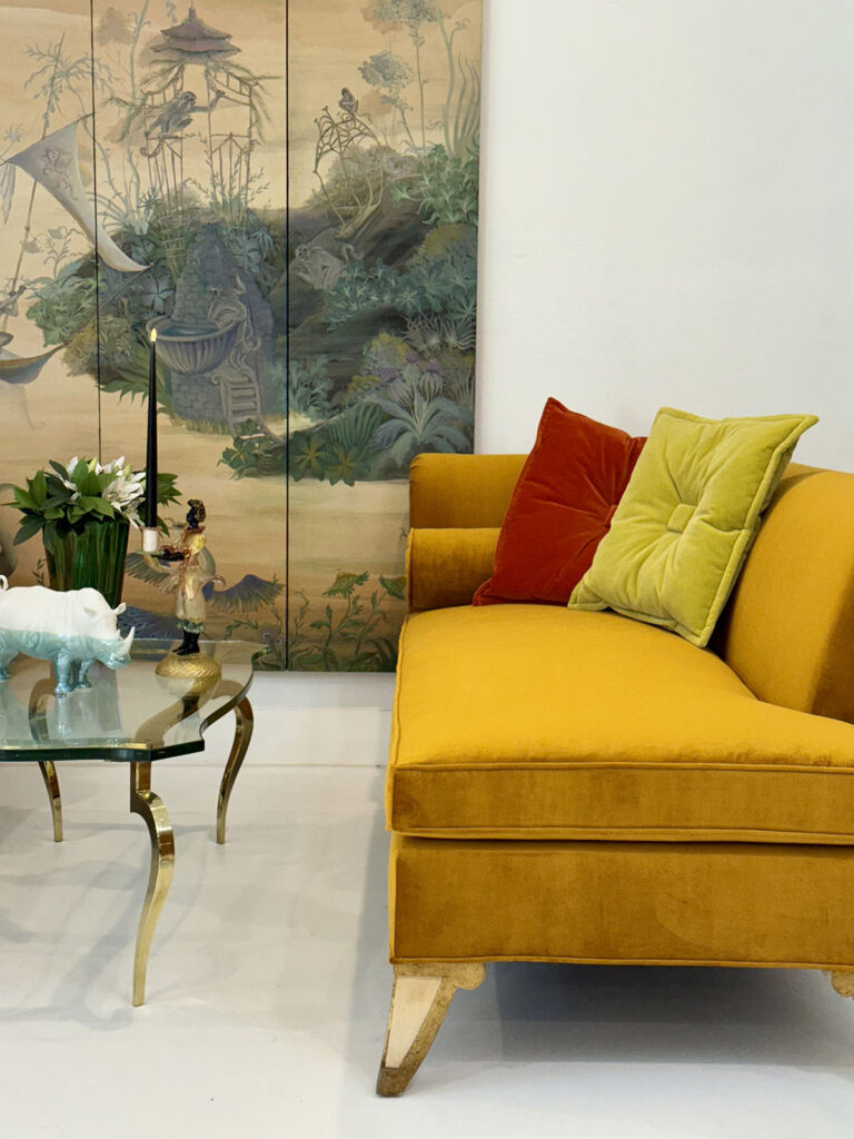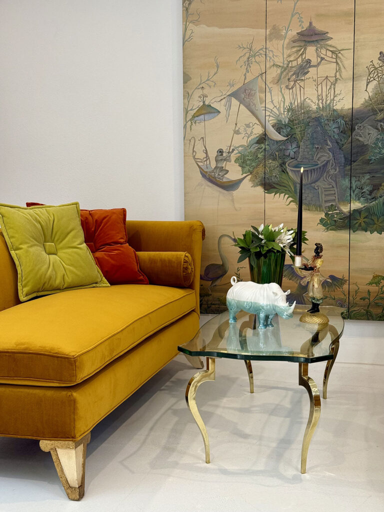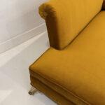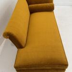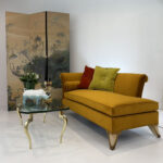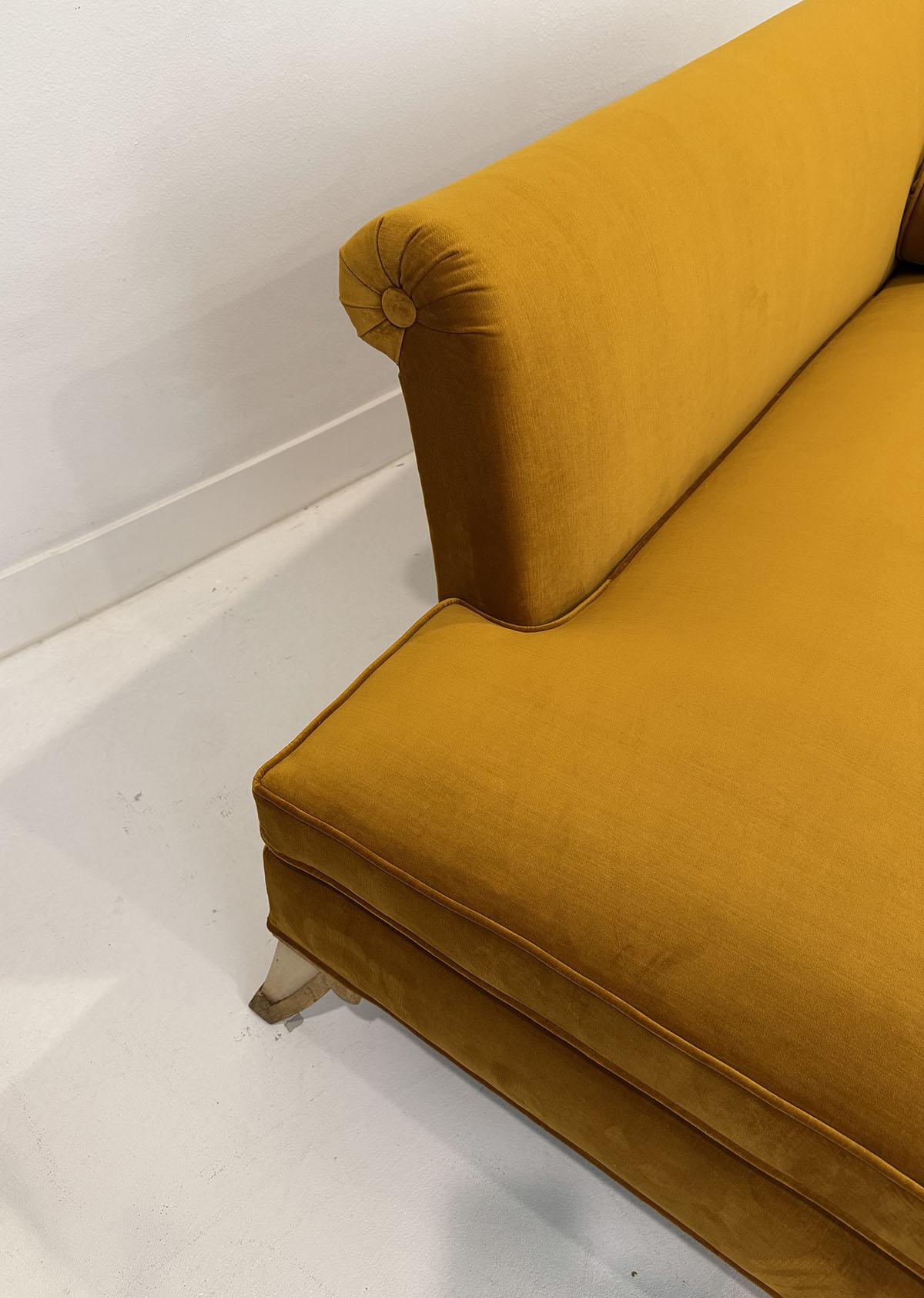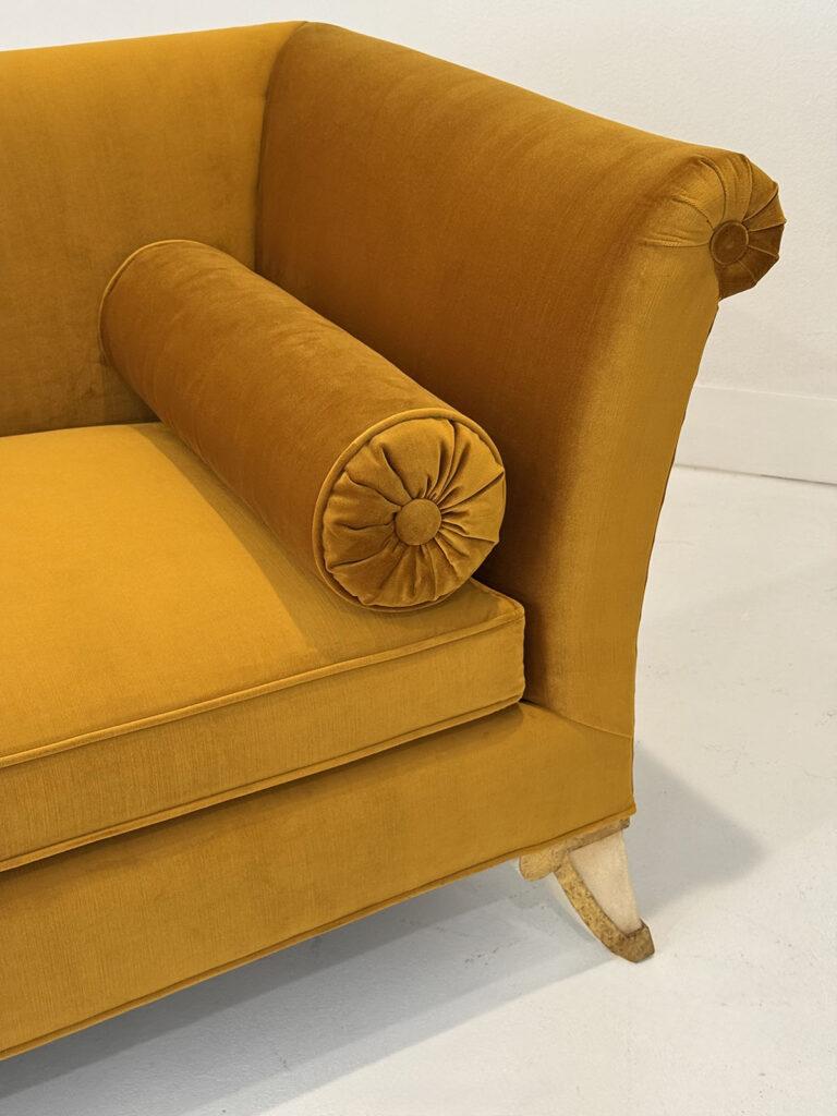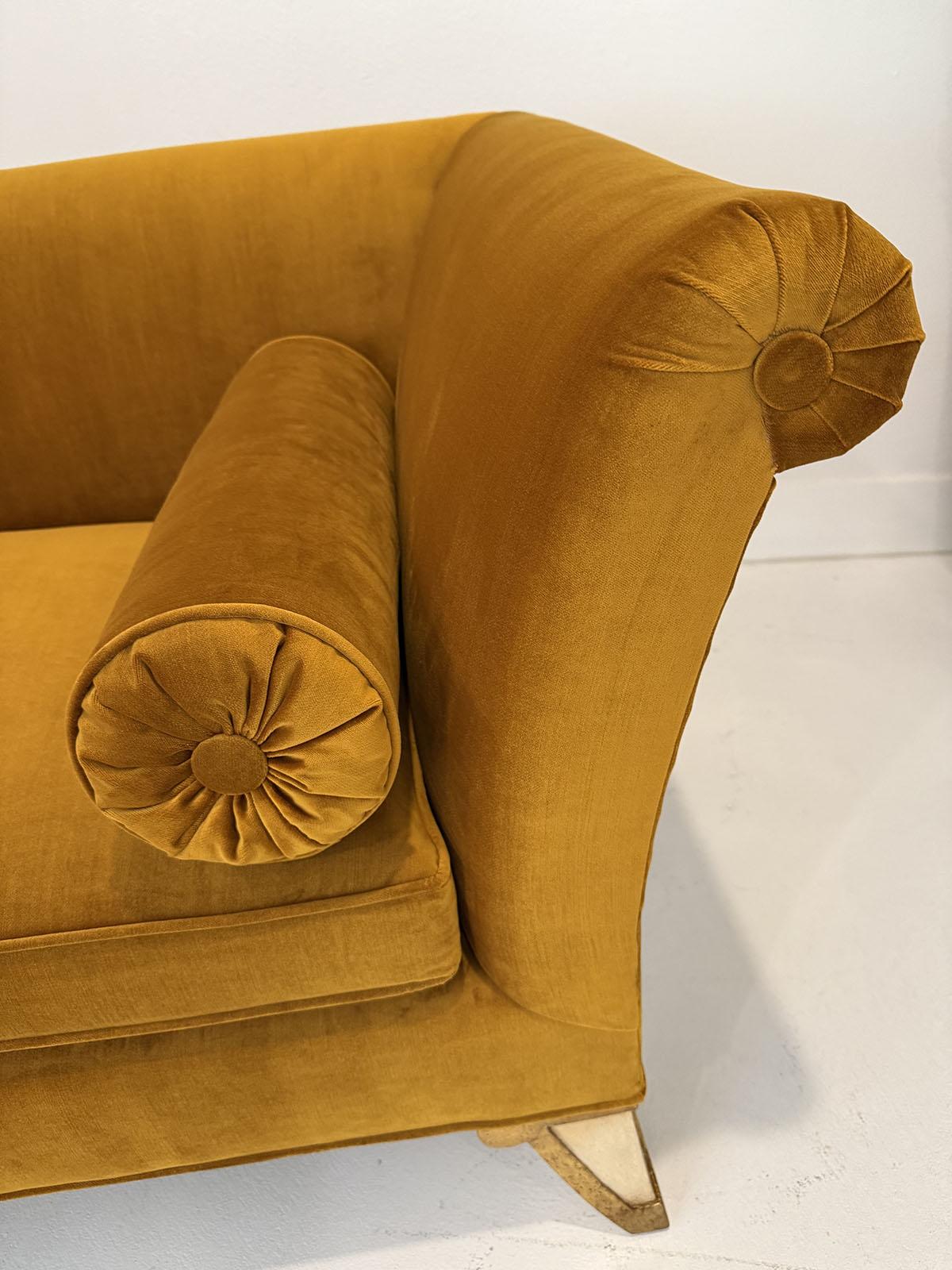 A striking and luxurious pair of custom méridienne chaises by George Doan, newly upholstered and sourced directly from the designer’s personal collection. The tailored silhouettes evoke classic French daybeds, reimagined through Doan’s refined, contemporary lens. Upholstered in a rich ochre velvet, the sofas are accented by dramatic scroll arms, crisp lines, and pale wood saber legs with subtle distressing and gold leafed details. Each piece features a left or right arm configuration for versatile placement in a mirrored arrangement or as stand-alone statement pieces.