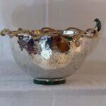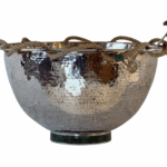 The interior reveals the warmth of the copper beneath the silver, emphasizing its handcrafted authenticity and time-earned patina. The ladle measures 14″H x 3.75″ diameter, beautifully proportioned to complement the bowl.