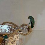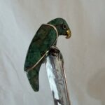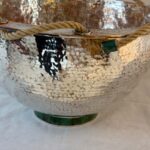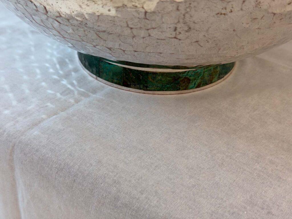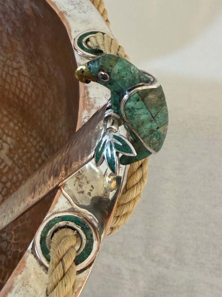 A remarkable hand-hammered silver-plated copper bowl by Emilia Castillo, showcasing the celebrated Mexican artisan’s signature fusion of silver, copper, and semiprecious stone. This exceptional piece features a rope-wrapped rim threaded through malachite-inlaid rings, resting on a circular malachite base. The bowl is paired with its original matching ladle, crowned by a sculptural parrot handle inlaid with malachite and silver, a recurring Castillo motif that symbolizes her love of nature.