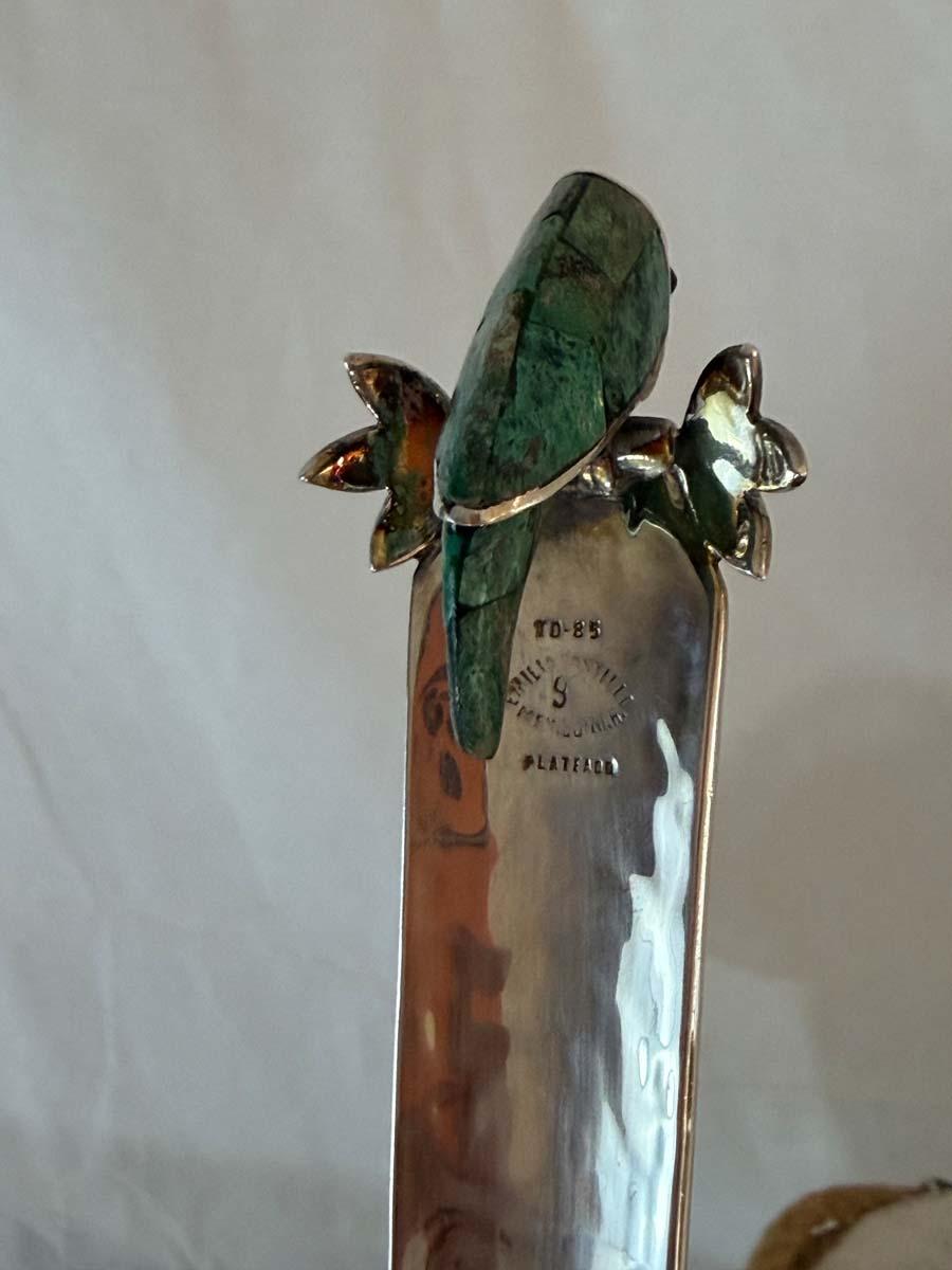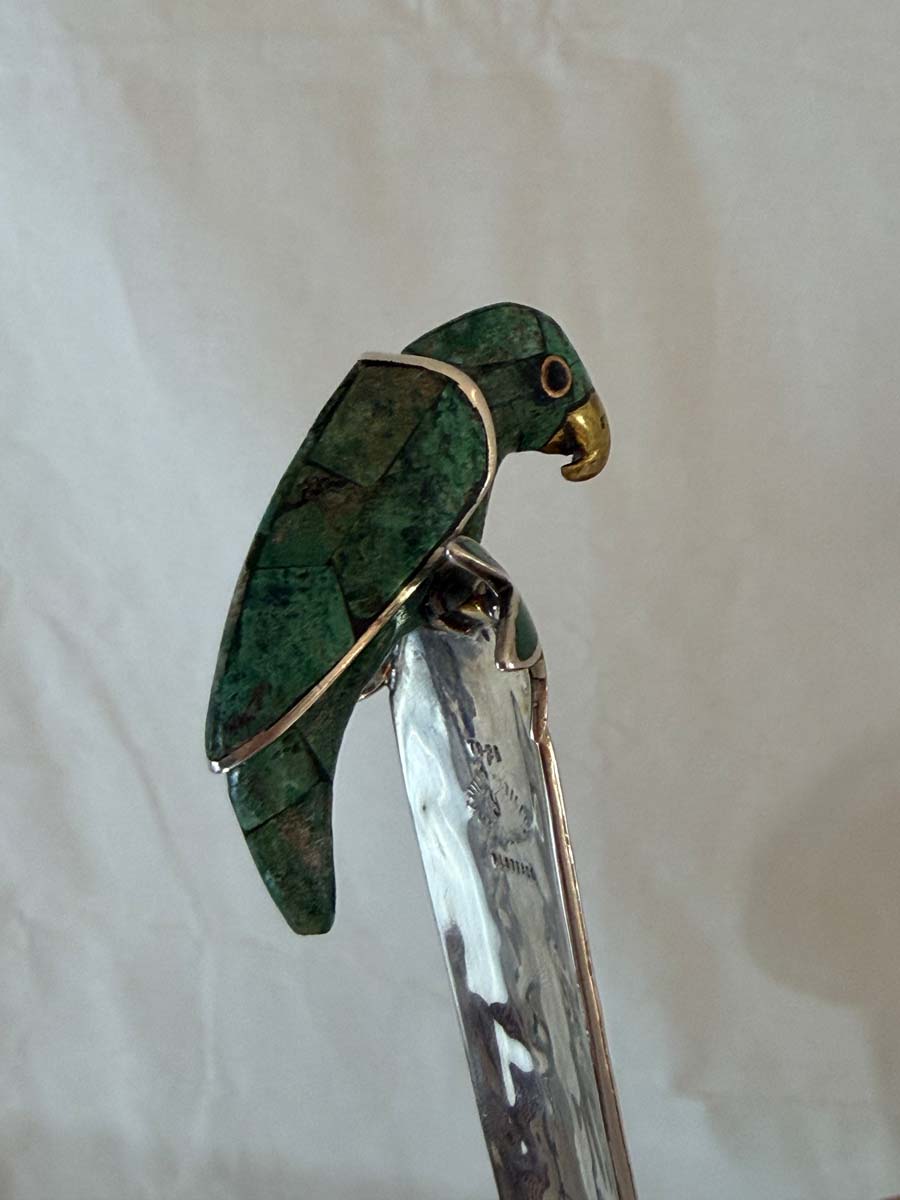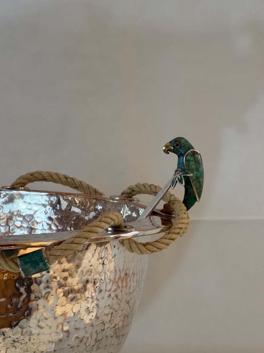 A remarkable hand-hammered silver-plated copper bowl by Emilia Castillo, showcasing the celebrated Mexican artisan’s signature fusion of silver, copper, and semiprecious stone. This exceptional piece features a rope-wrapped rim threaded through malachite-inlaid rings, resting on a circular malachite base. The bowl is paired with its original matching ladle, crowned by a sculptural parrot handle inlaid with malachite and silver, a recurring Castillo motif that symbolizes her love of nature.