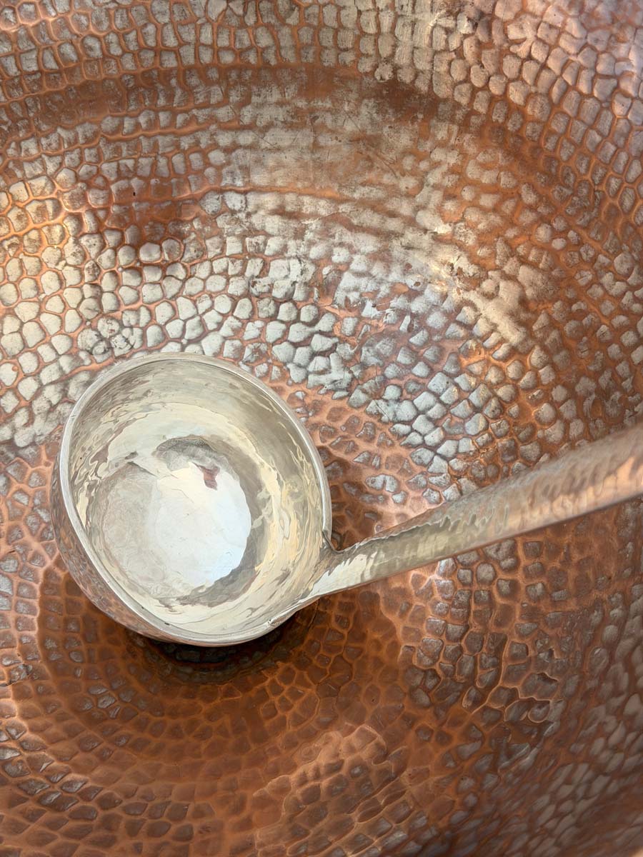 The interior reveals the warmth of the copper beneath the silver, emphasizing its handcrafted authenticity and time-earned patina. The ladle measures 14″H x 3.75″ diameter, beautifully proportioned to complement the bowl.