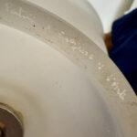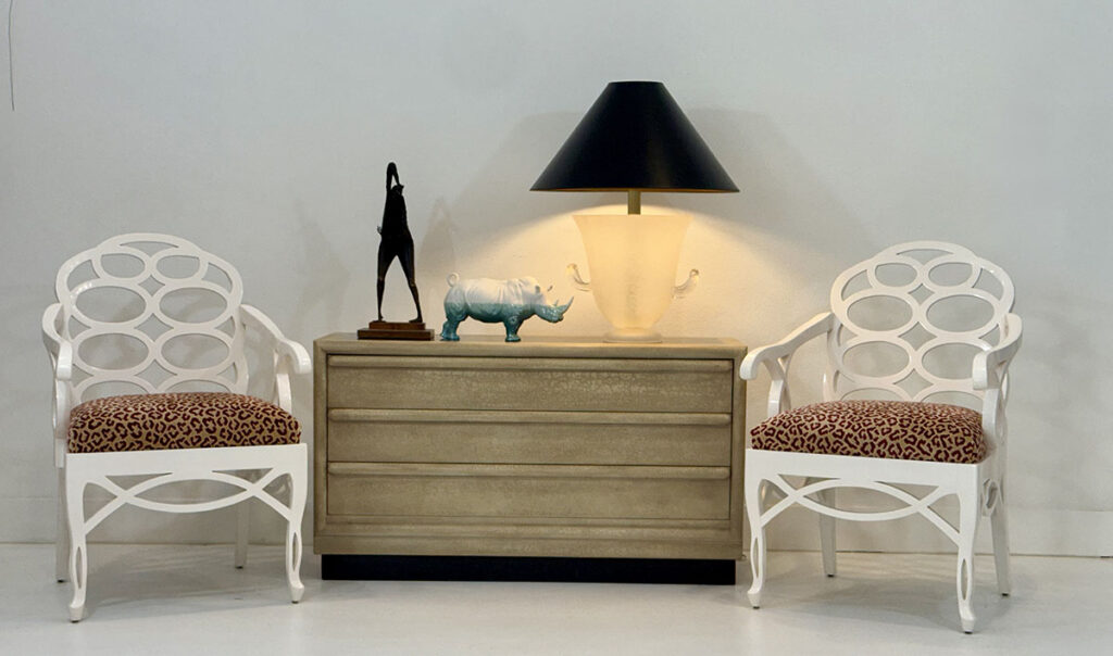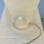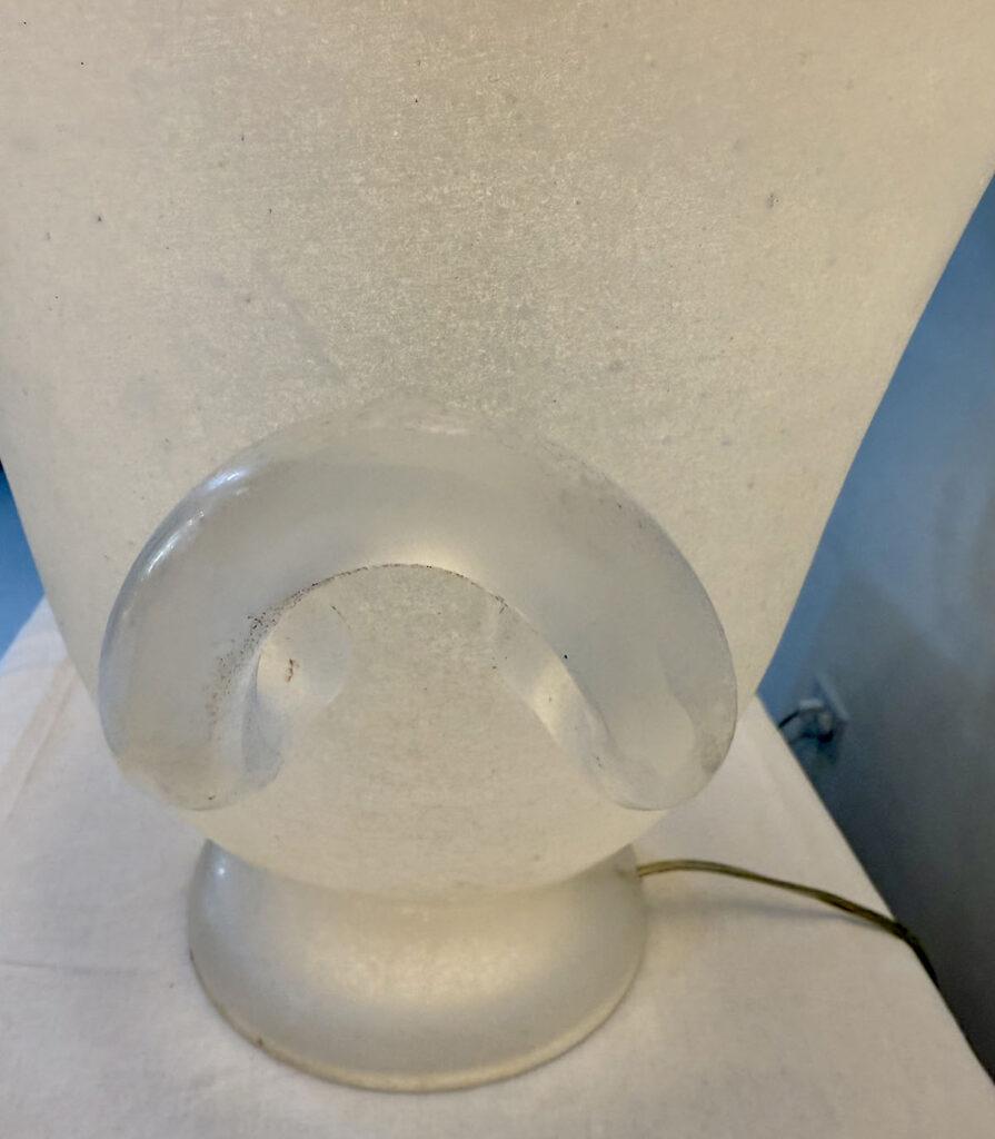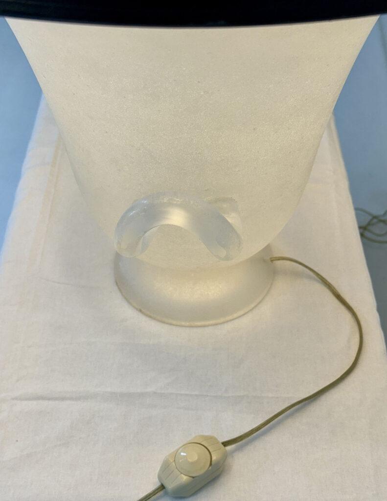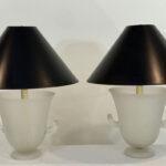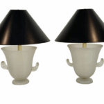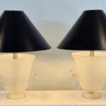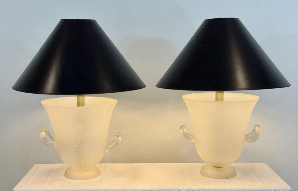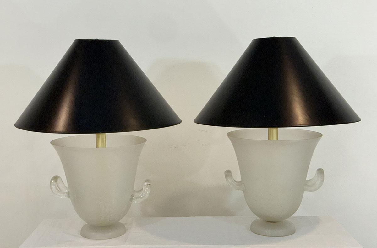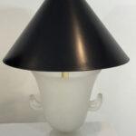 This striking pair of signed Giovanni Patrini for Seguso Verti d’Arte Coroso finished urn form lamps exemplifies the refined elegance and craftsmanship of Murano glass artistry. Each lamp features a gracefully flared frosted glass body with a textured satin finish, designed in the classical shape of a two-handled urn. Graceful applied scroll handles provide a subtle yet sculptural contrast to the straight forward form highlighting the artisanal quality of the piece. The lamps rest on simple round bases. Photographed with sleek, dramatic black conical shades that provide a bold, contemporary counterpoint to the neoclassical silhouette.