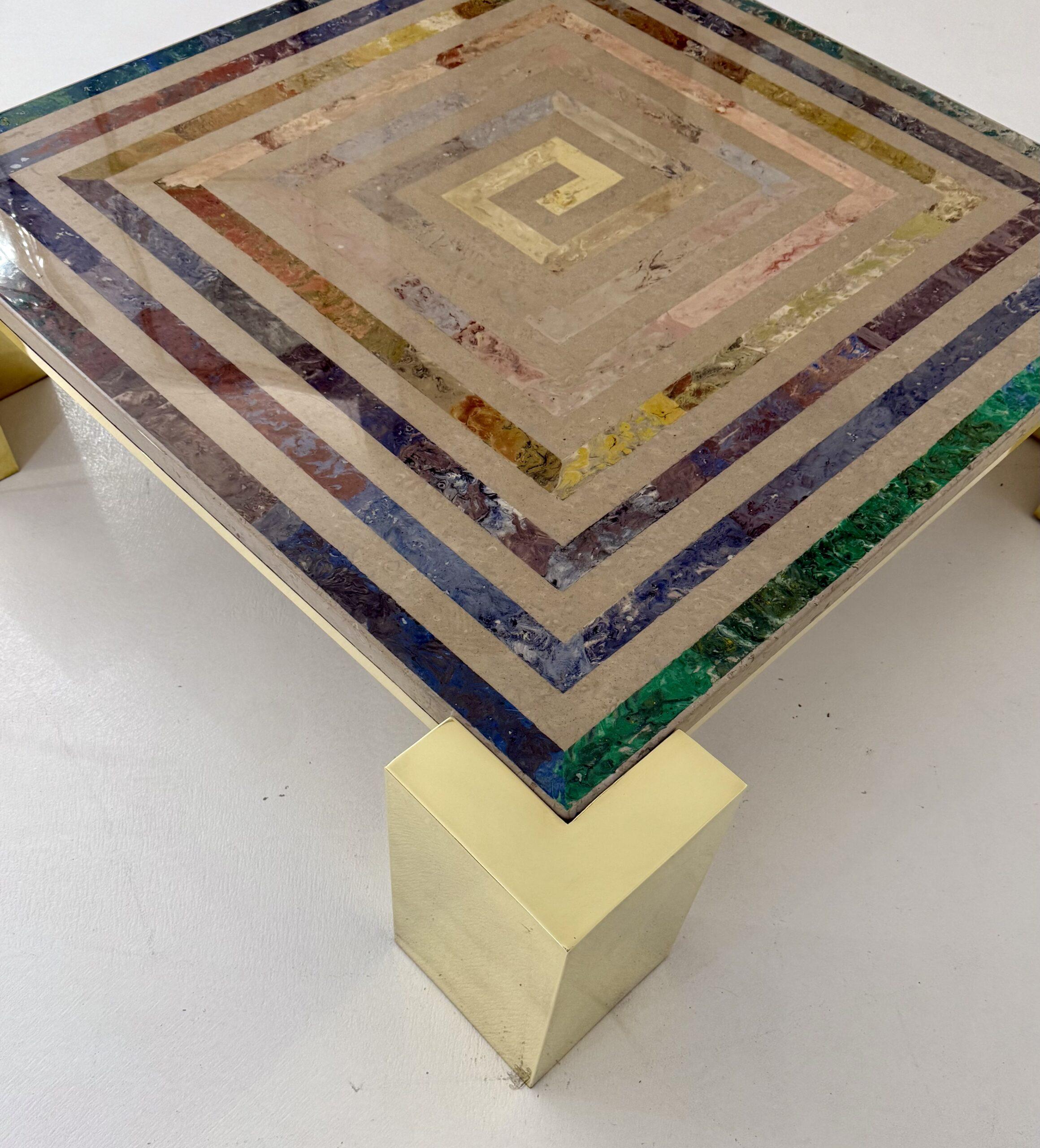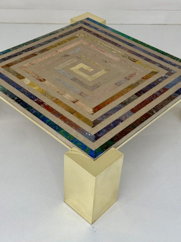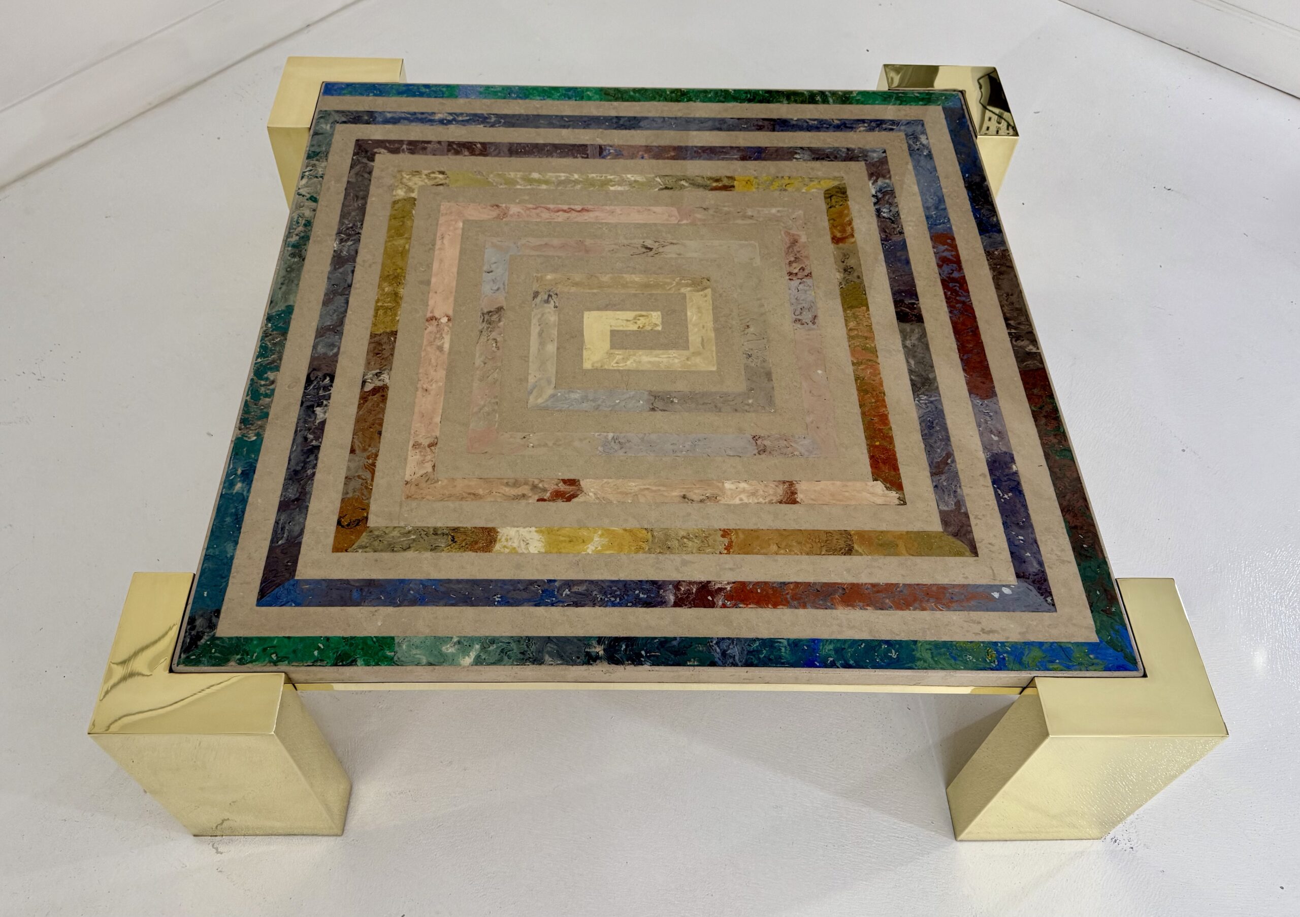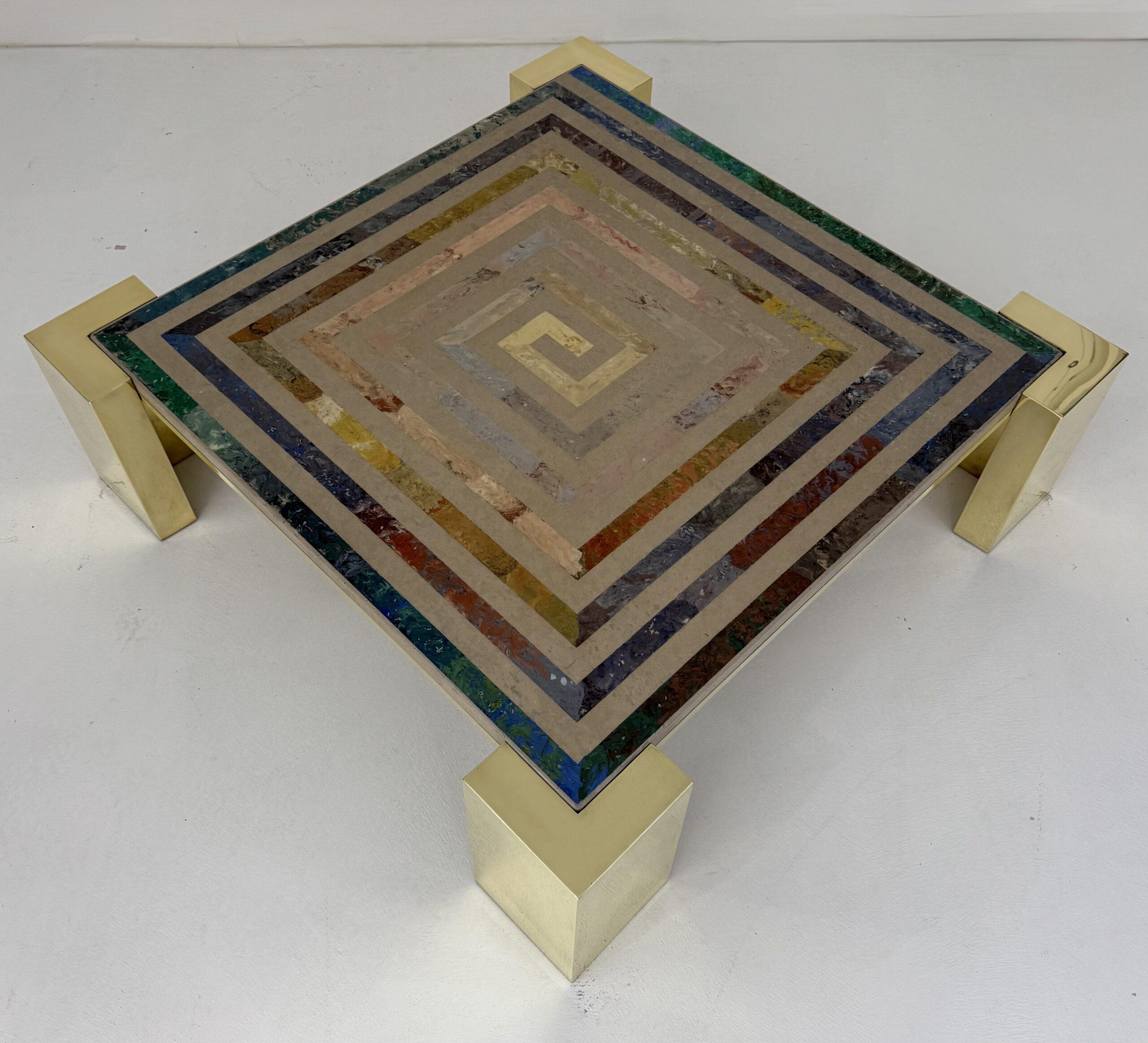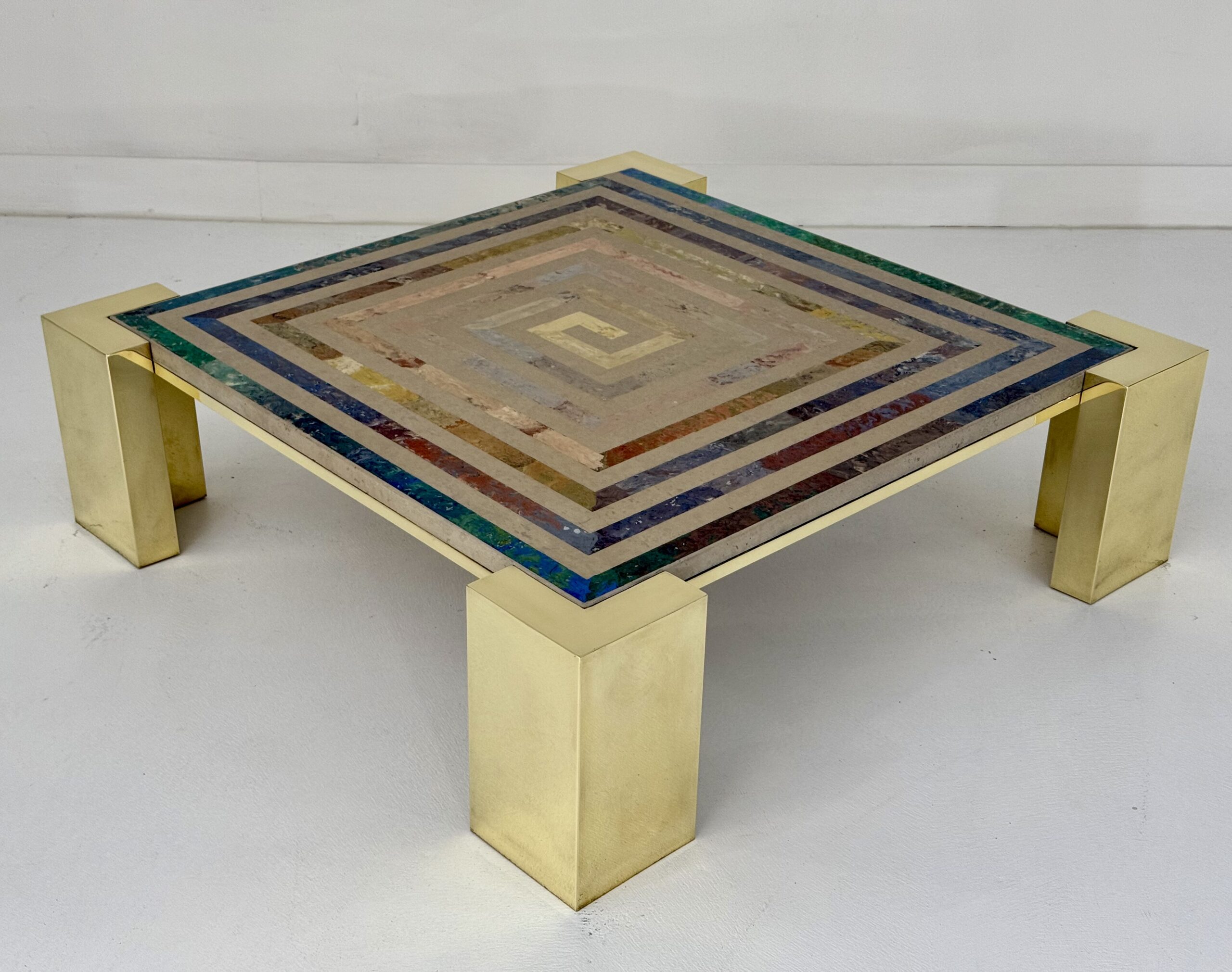 A striking and sophisticated cocktail table by Italian designer Marcello Mioni, dating from the 1970s. This sculptural piece features a solid brass base with bold geometric legs that provide a strong architectural presence. The tabletop is a mesmerizing composition of inlaid composite and semiprecious stones, cut into a labyrinthine spiral motif that radiates from the center outward in multicolored concentric squares. The precision of the pattern and the vibrant interplay of natural tones—ranging from lapis and malachite green to coral, ochre, and deep burgundy—create a visual rhythm that evokes Italian Op Art and Postmodern aesthetics. The polished brass finish lends a luxurious contrast to the tactile surface of the inlay. A standout statement piece that reflects the Italian commitment to craftsmanship, artistry, and design innovation. Ideal for collectors and interiors with a flair for bold, graphic luxury.