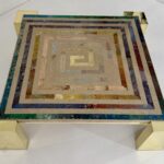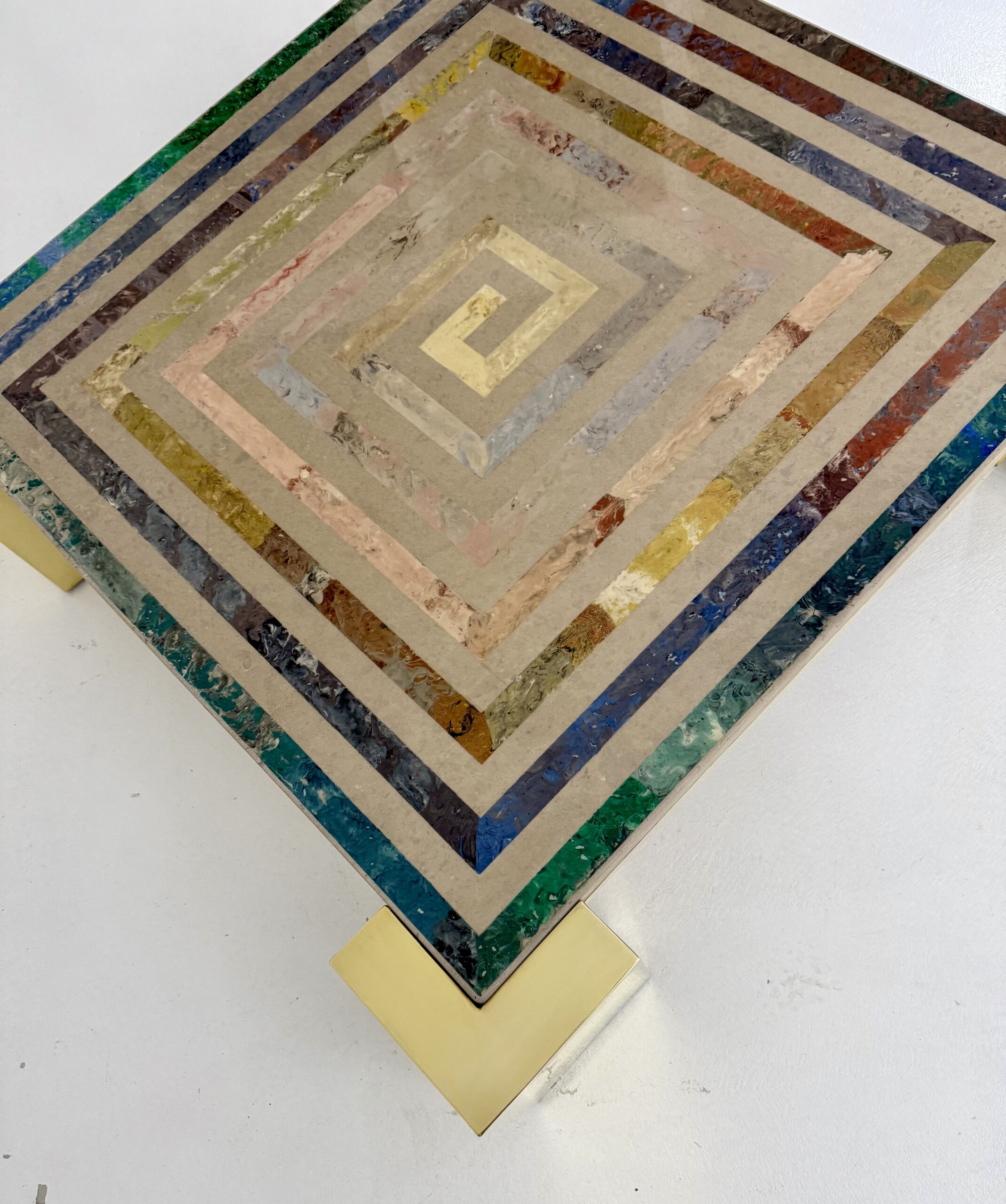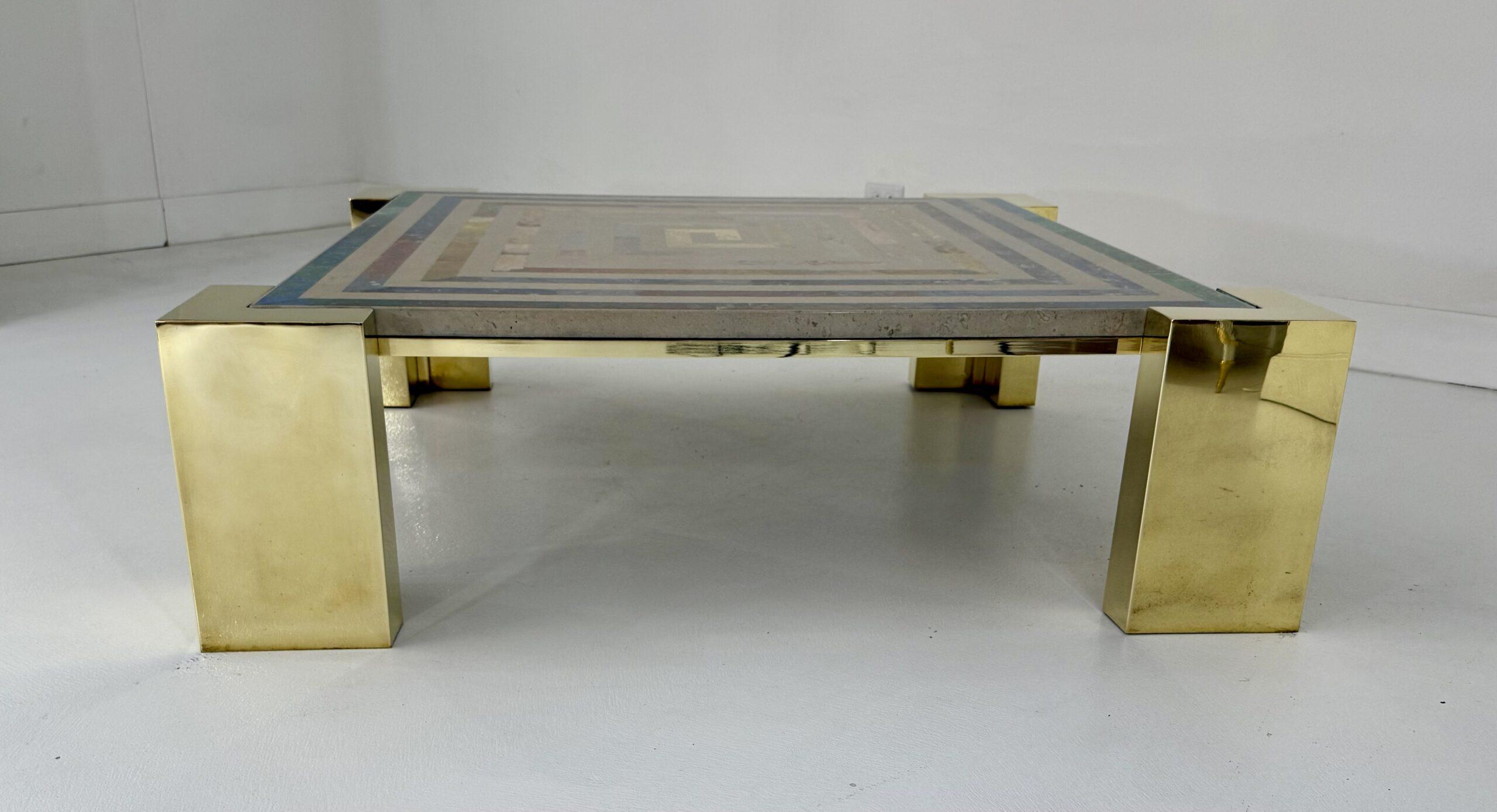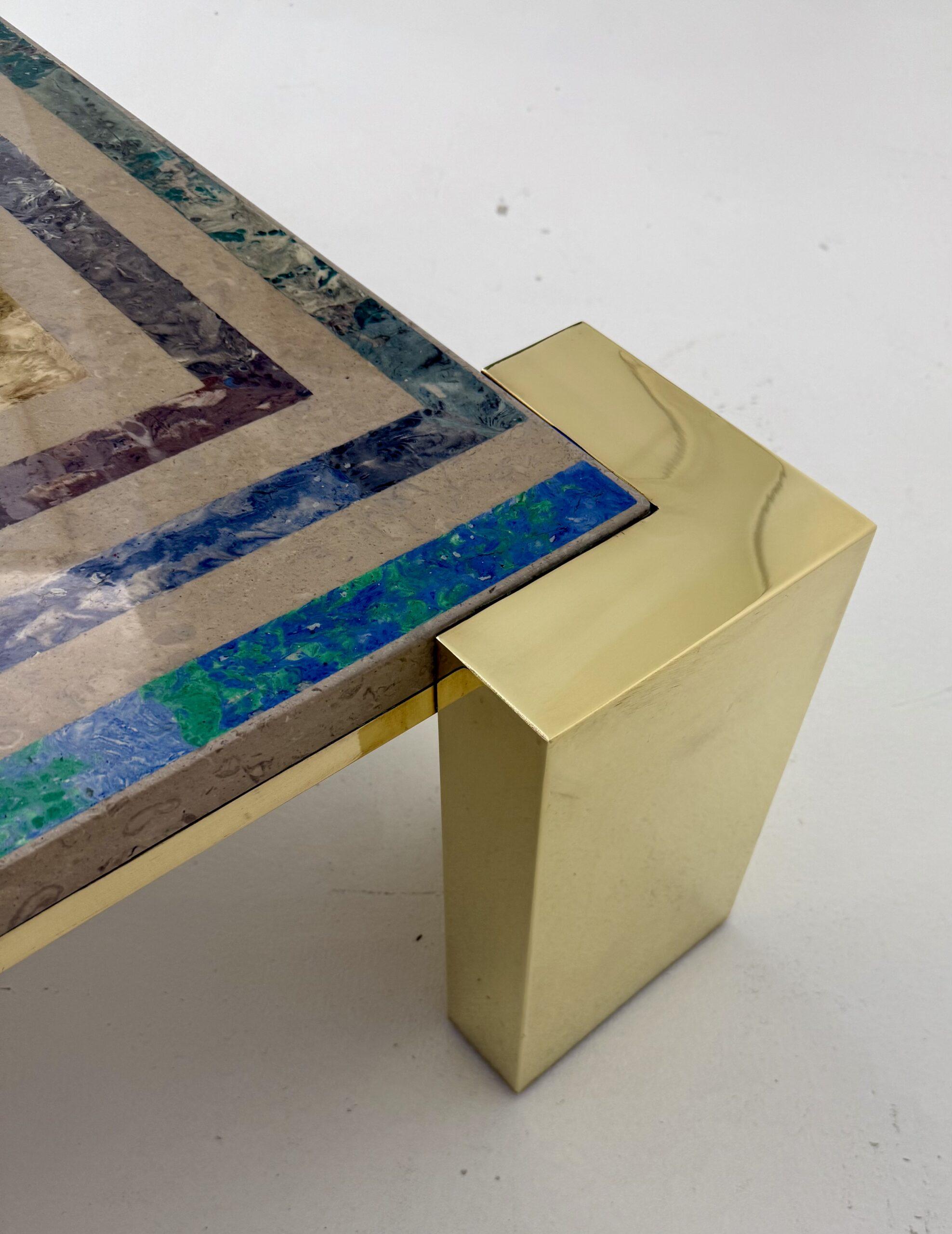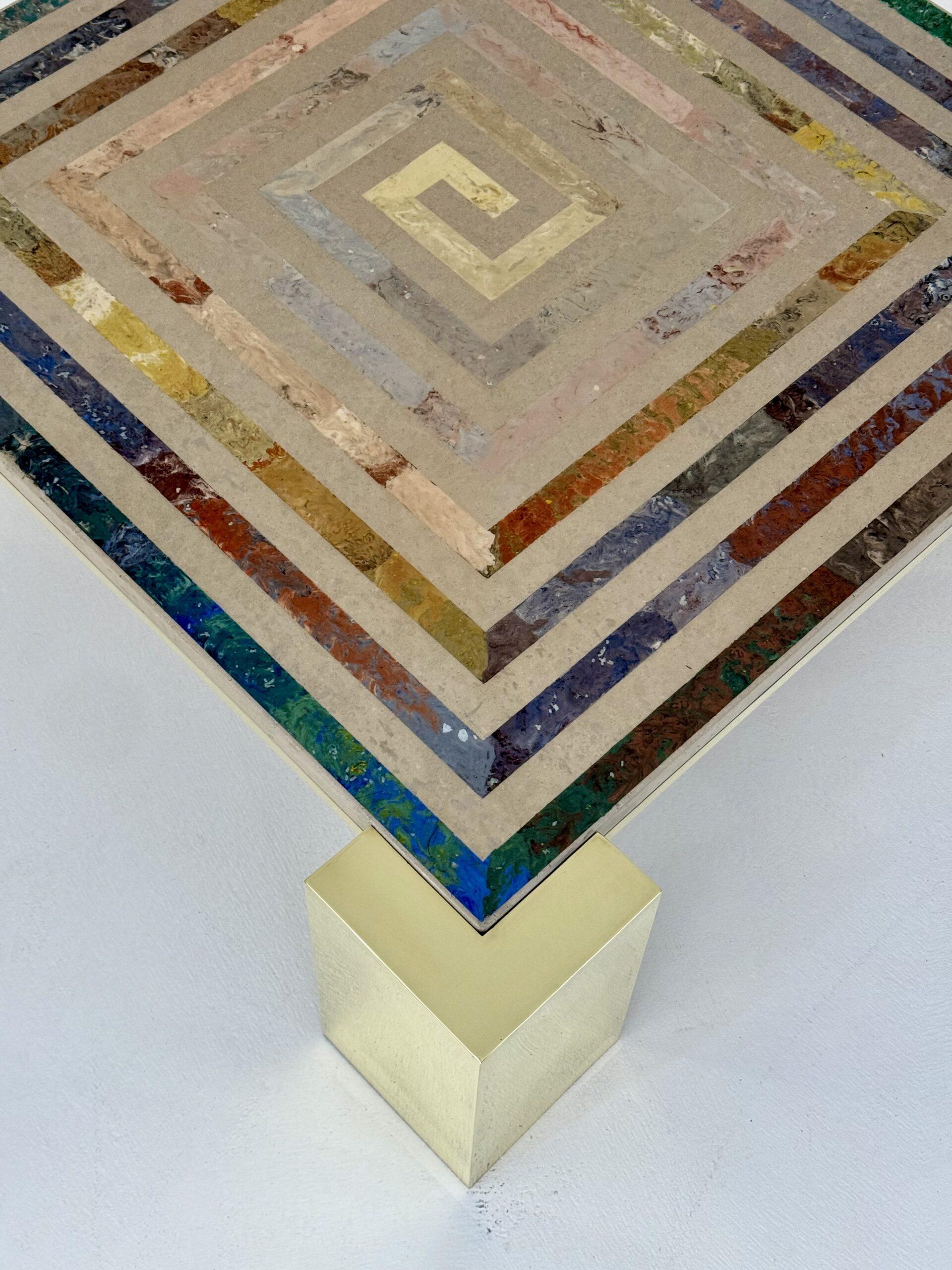 A striking and sophisticated cocktail table by Italian designer Marcello Mioni, dating from the 1970s. This sculptural piece features a solid brass base with bold geometric legs that provide a strong architectural presence. The tabletop is a mesmerizing composition of inlaid composite and semiprecious stones, cut into a labyrinthine spiral motif that radiates from the center outward in multicolored concentric squares. The precision of the pattern and the vibrant interplay of natural tones—ranging from lapis and malachite green to coral, ochre, and deep burgundy—create a visual rhythm that evokes Italian Op Art and Postmodern aesthetics. The polished brass finish lends a luxurious contrast to the tactile surface of the inlay. A standout statement piece that reflects the Italian commitment to craftsmanship, artistry, and design innovation. Ideal for collectors and interiors with a flair for bold, graphic luxury.