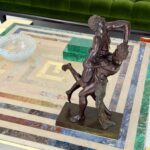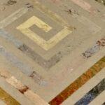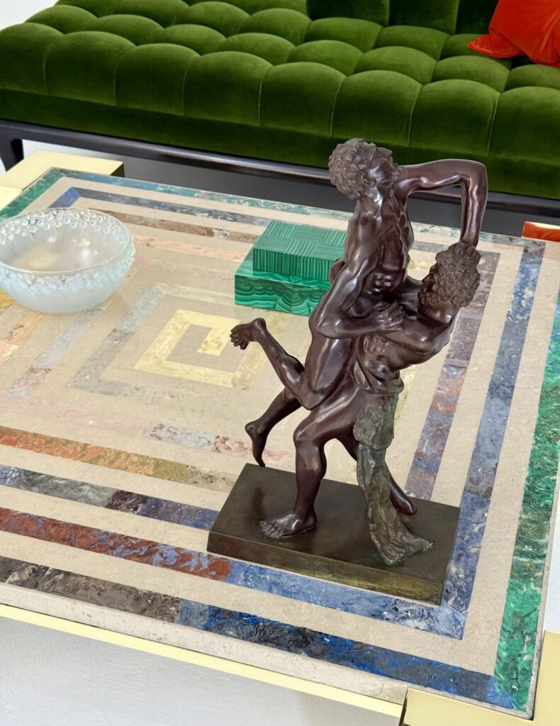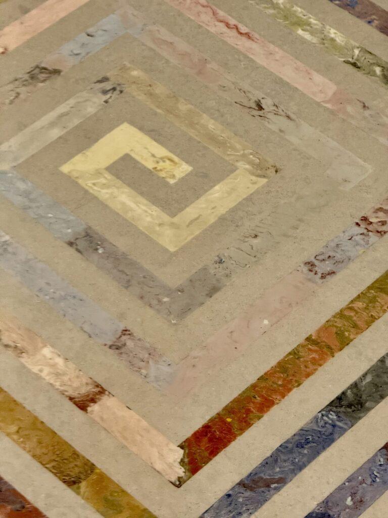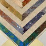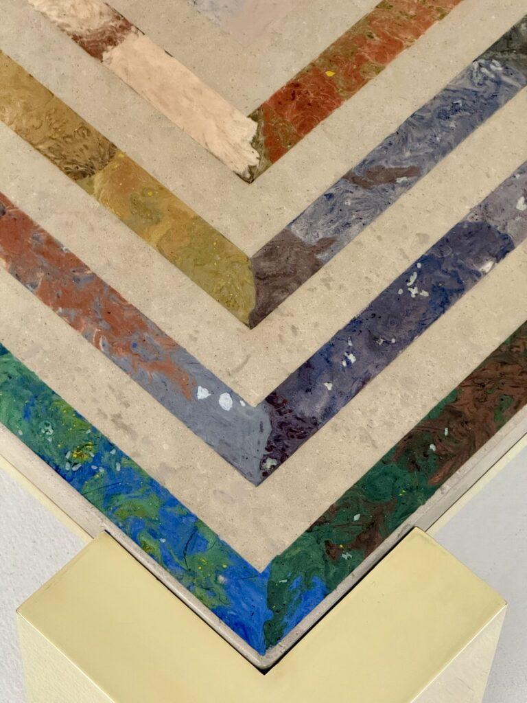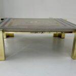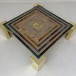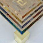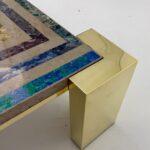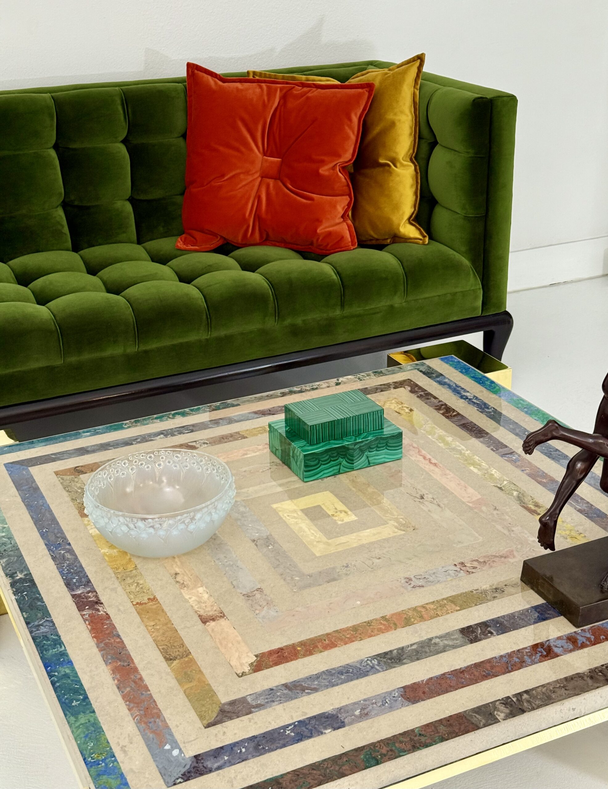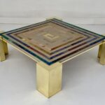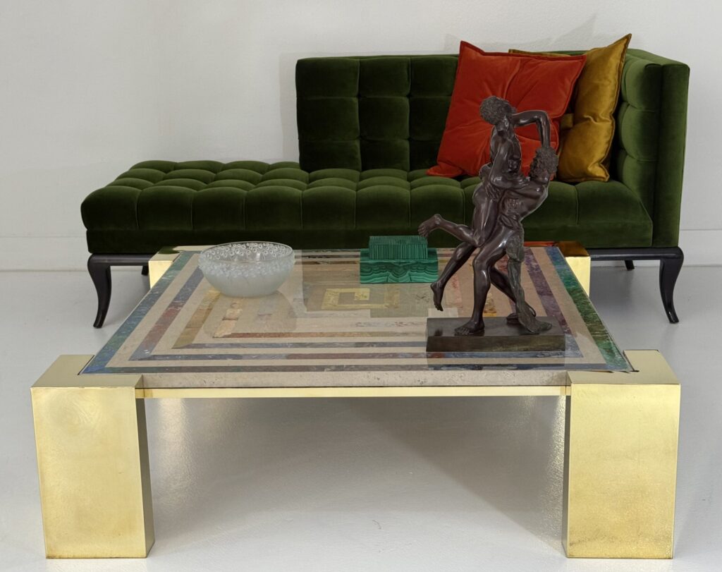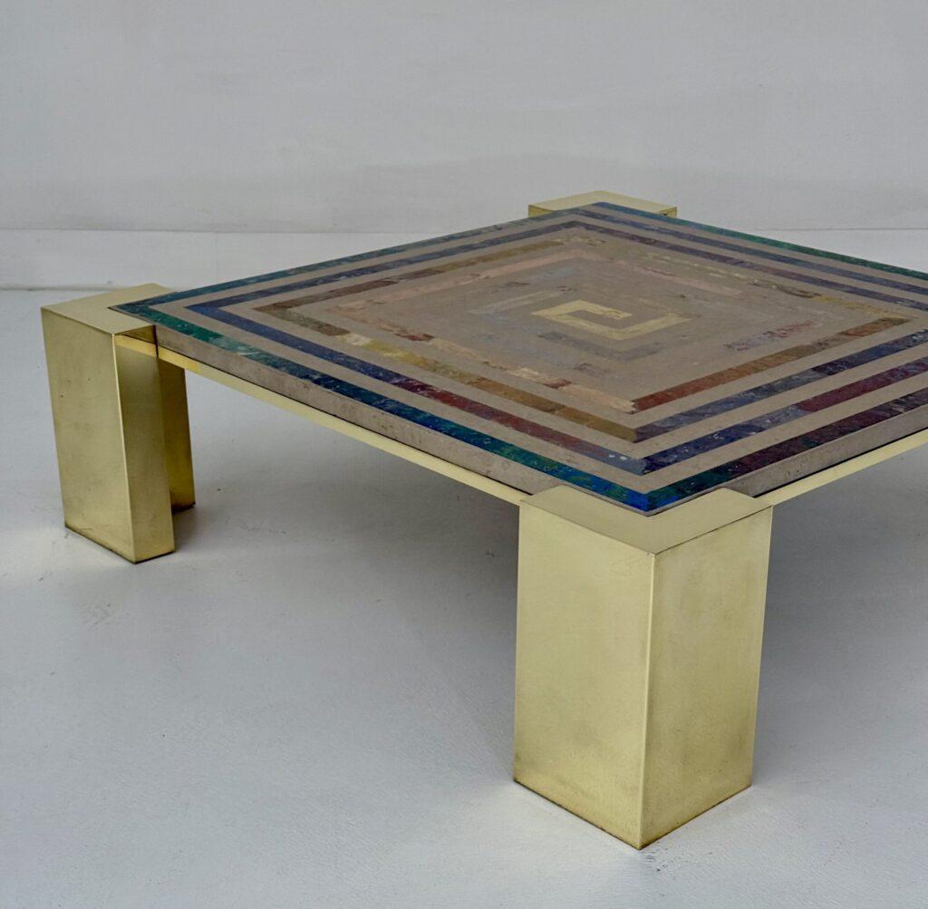 A striking and sophisticated cocktail table by Italian designer Marcello Mioni, dating from the 1970s. This sculptural piece features a solid brass base with bold geometric legs that provide a strong architectural presence. The tabletop is a mesmerizing composition of inlaid composite and semiprecious stones, cut into a labyrinthine spiral motif that radiates from the center outward in multicolored concentric squares. The precision of the pattern and the vibrant interplay of natural tones—ranging from lapis and malachite green to coral, ochre, and deep burgundy—create a visual rhythm that evokes Italian Op Art and Postmodern aesthetics. The polished brass finish lends a luxurious contrast to the tactile surface of the inlay. A standout statement piece that reflects the Italian commitment to craftsmanship, artistry, and design innovation. Ideal for collectors and interiors with a flair for bold, graphic luxury.