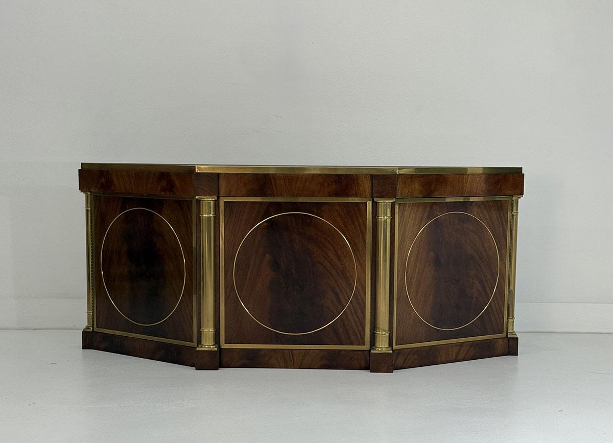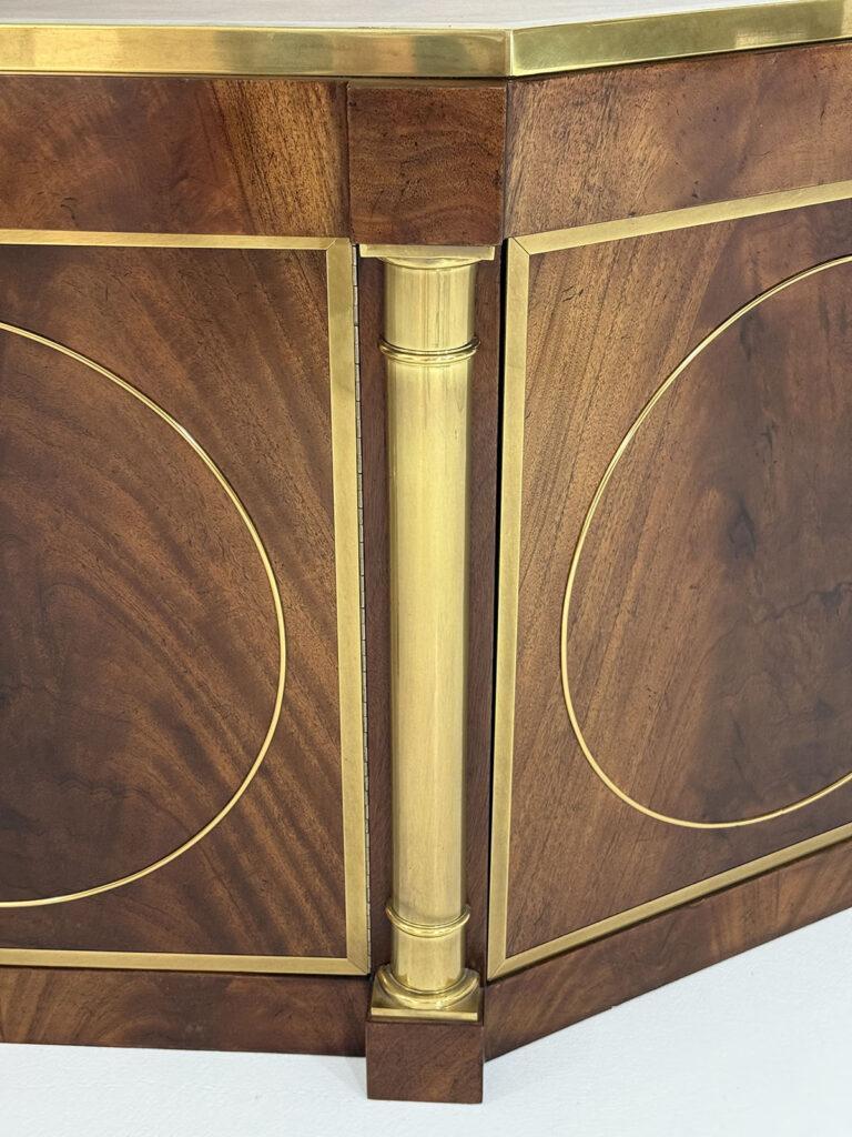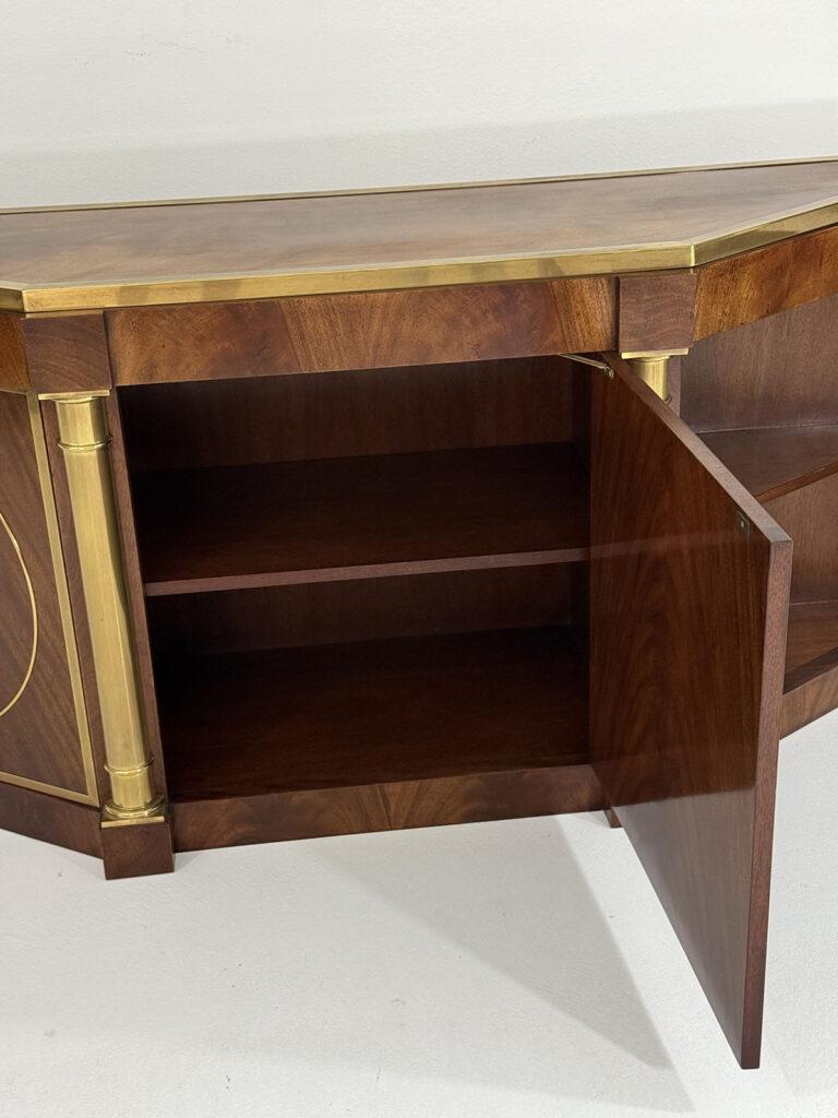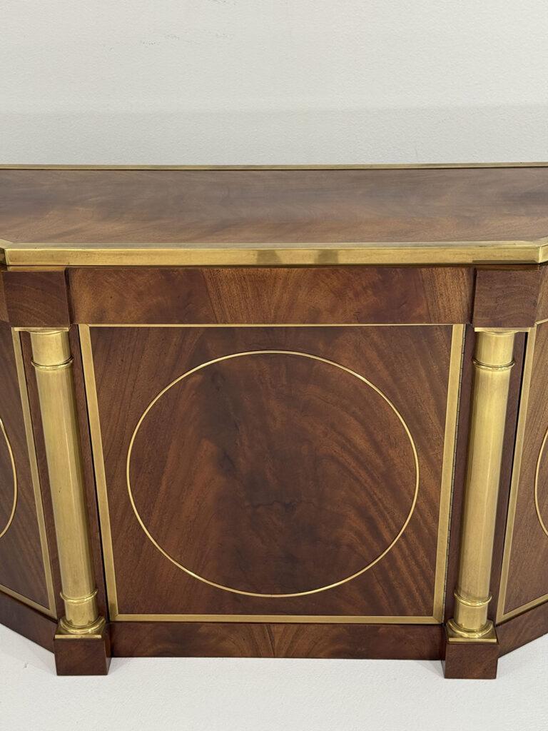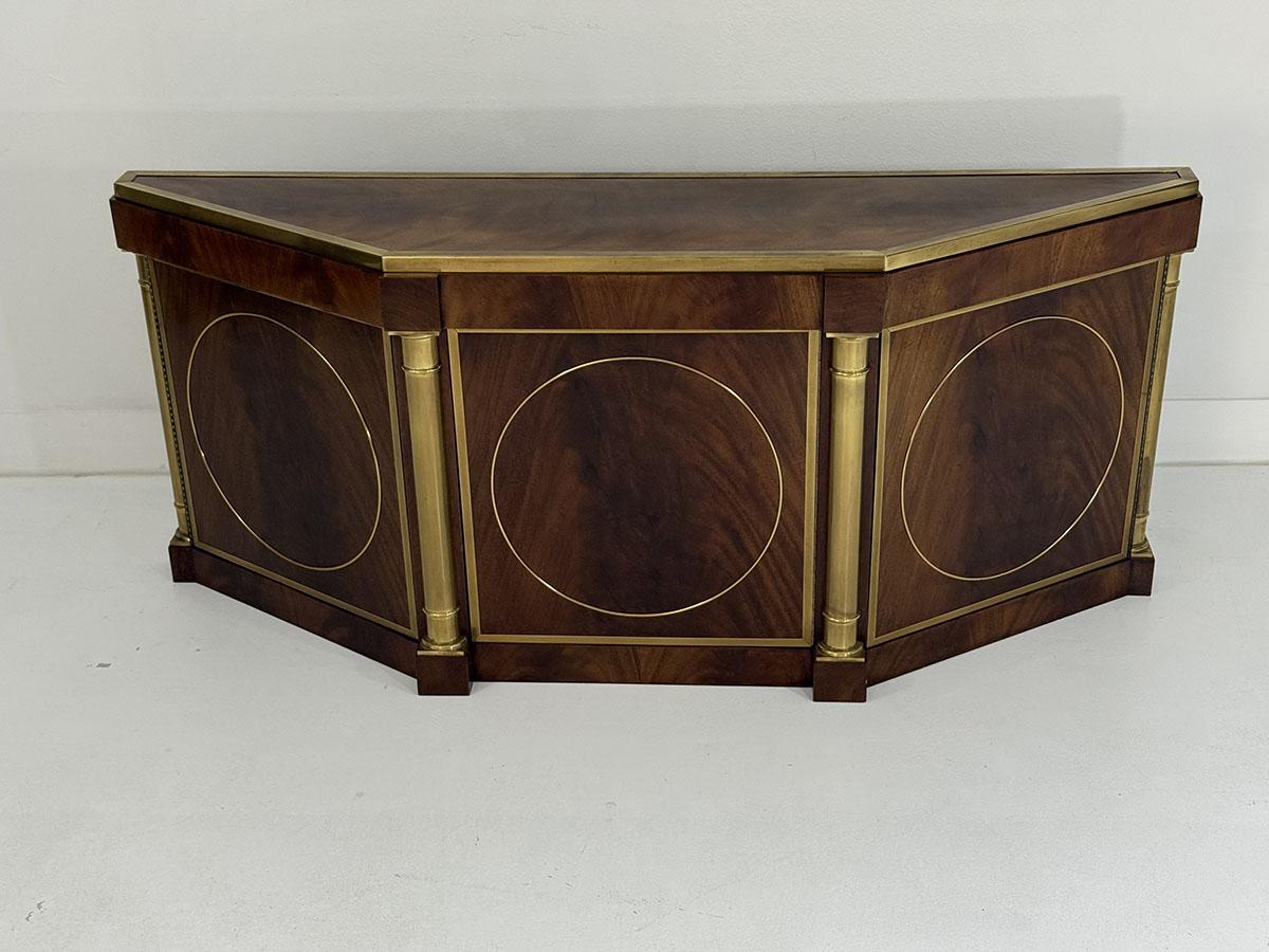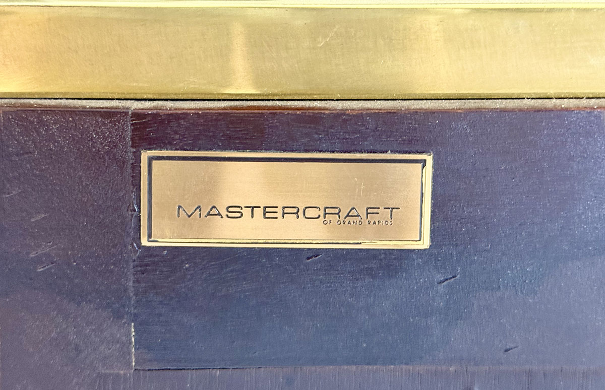 This elegant three-door credenza by Mastercraft of Grand Rapids exemplifies the brand’s reputation for refined craftsmanship and timeless design. The case is crafted from richly grained wood, accented with inset brass trim forming circular motifs on each door and complemented by brass columns at the corners. The top edge is finished with a sleek brass band, enhancing the piece’s architectural presence. The interior features an adjustable shelf in the center and fixed shelves on either side, providing ample concealed storage. Bearing the original Mastercraft brass tag on the back, this piece blends modernist precision with classical detailing, making it a sophisticated addition to both traditional and contemporary interiors.