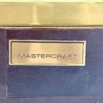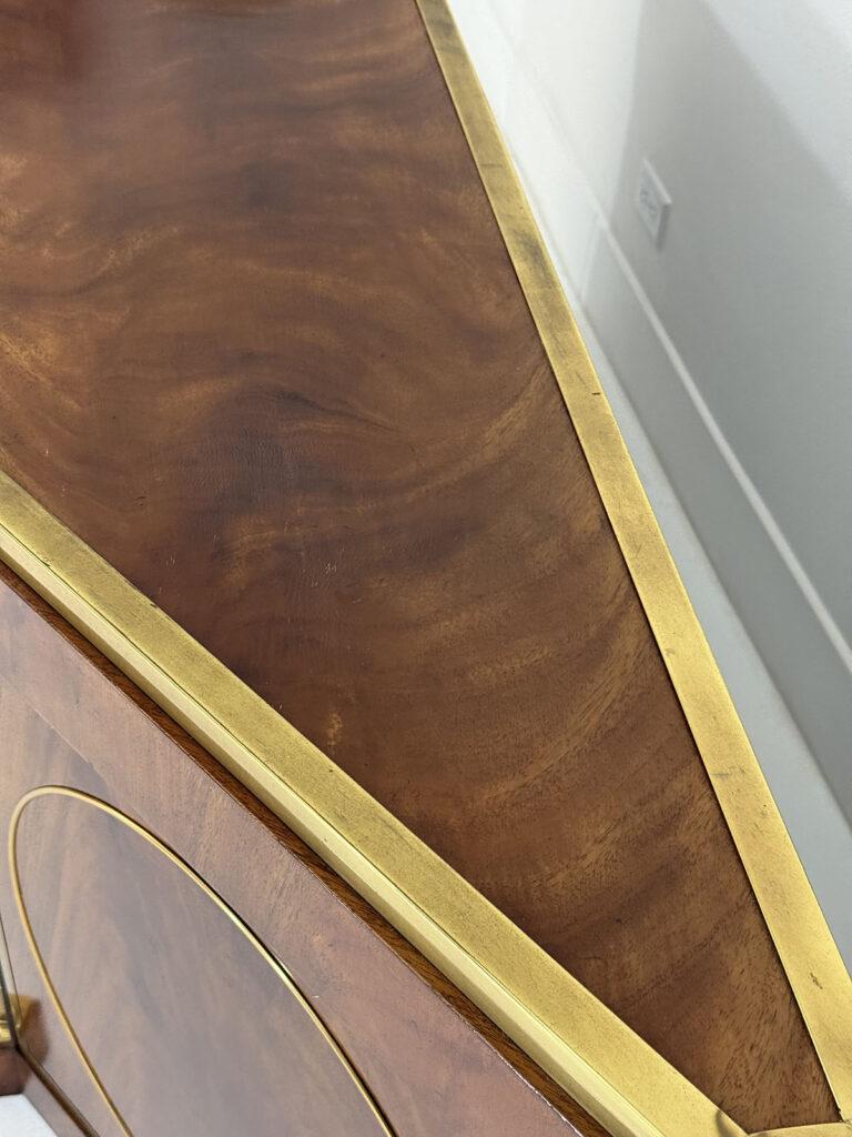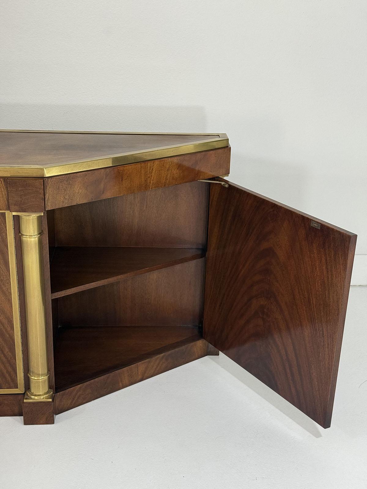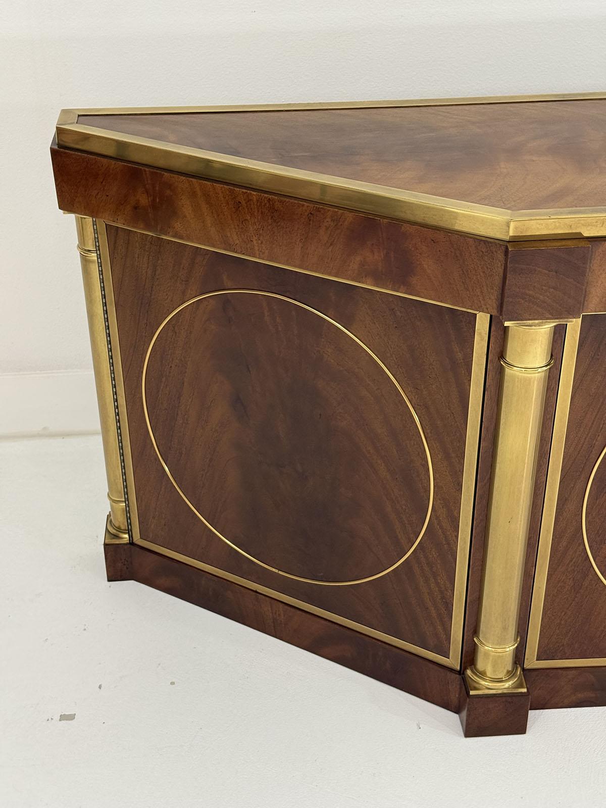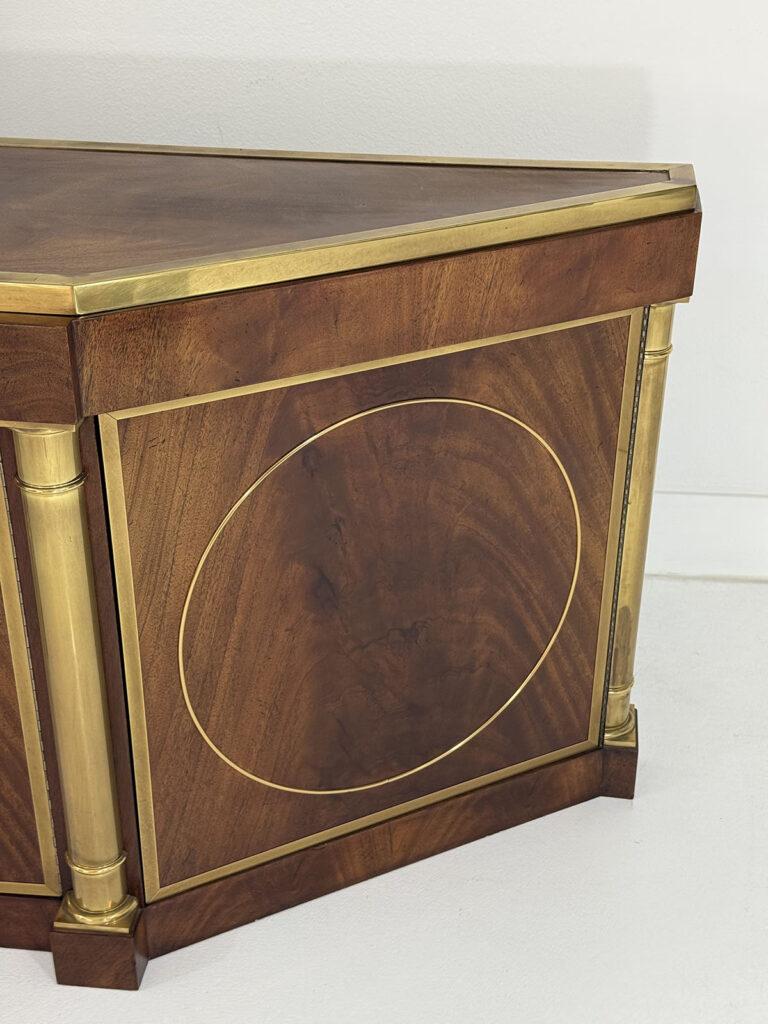 This elegant three-door credenza by Mastercraft of Grand Rapids exemplifies the brand’s reputation for refined craftsmanship and timeless design. The case is crafted from richly grained wood, accented with inset brass trim forming circular motifs on each door and complemented by brass columns at the corners. The top edge is finished with a sleek brass band, enhancing the piece’s architectural presence. The interior features an adjustable shelf in the center and fixed shelves on either side, providing ample concealed storage. Bearing the original Mastercraft brass tag on the back, this piece blends modernist precision with classical detailing, making it a sophisticated addition to both traditional and contemporary interiors.