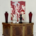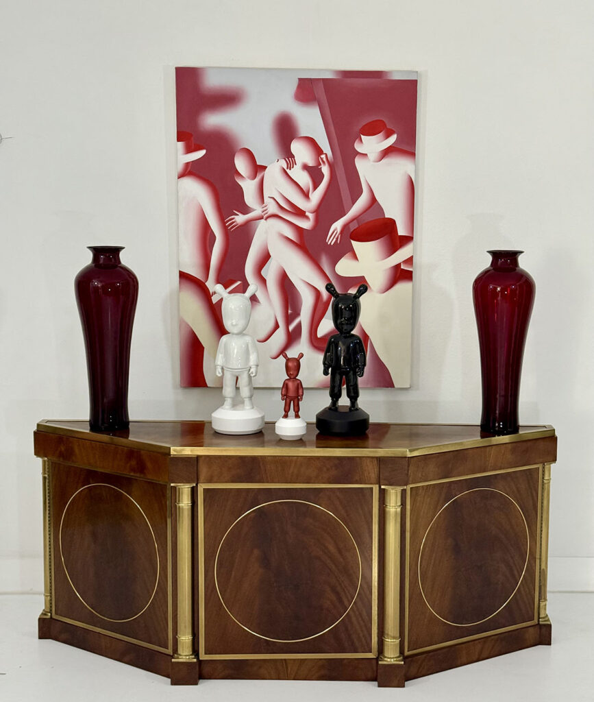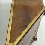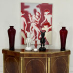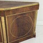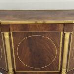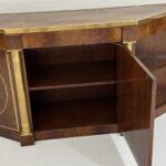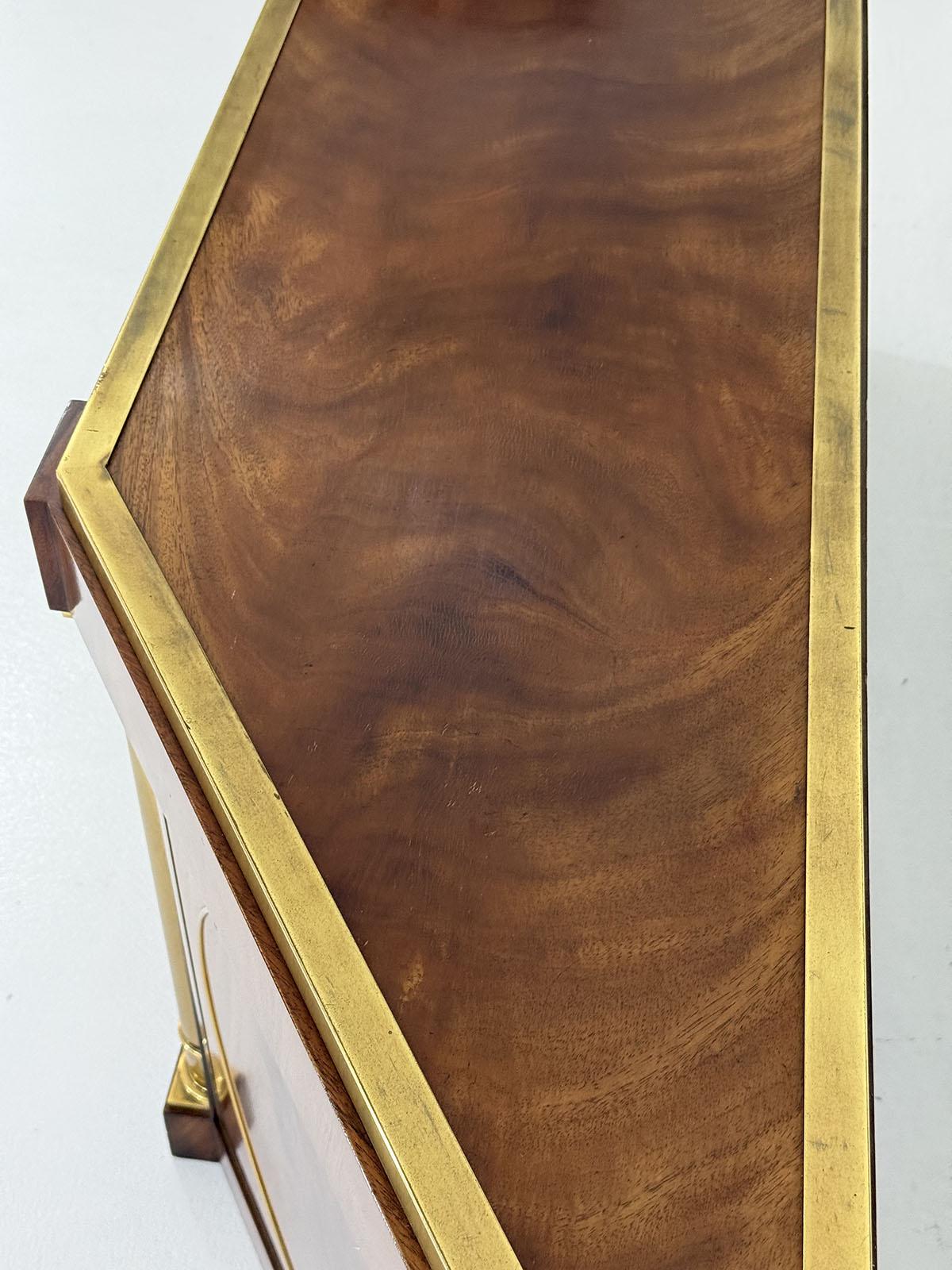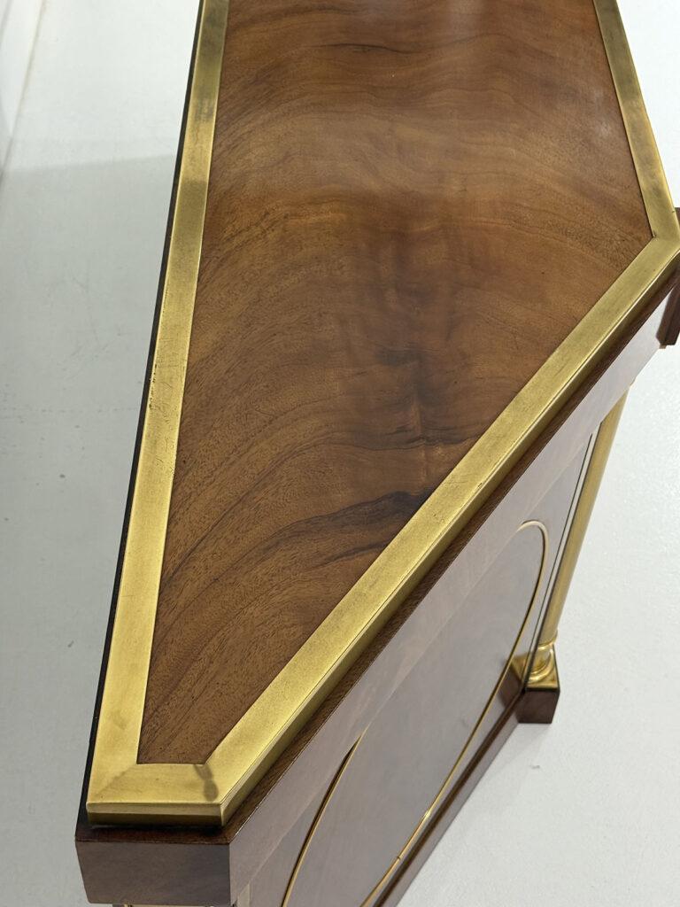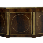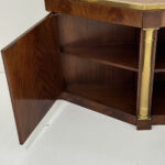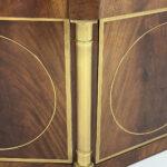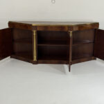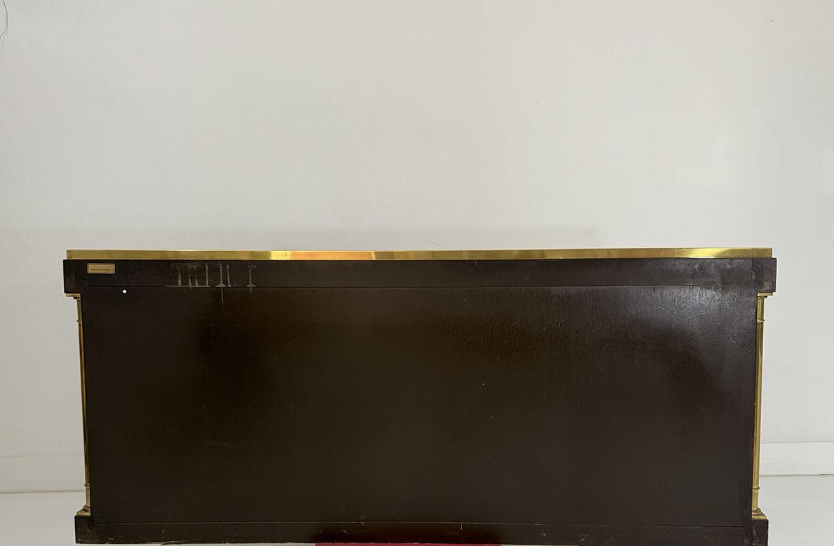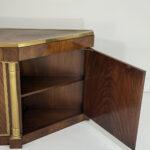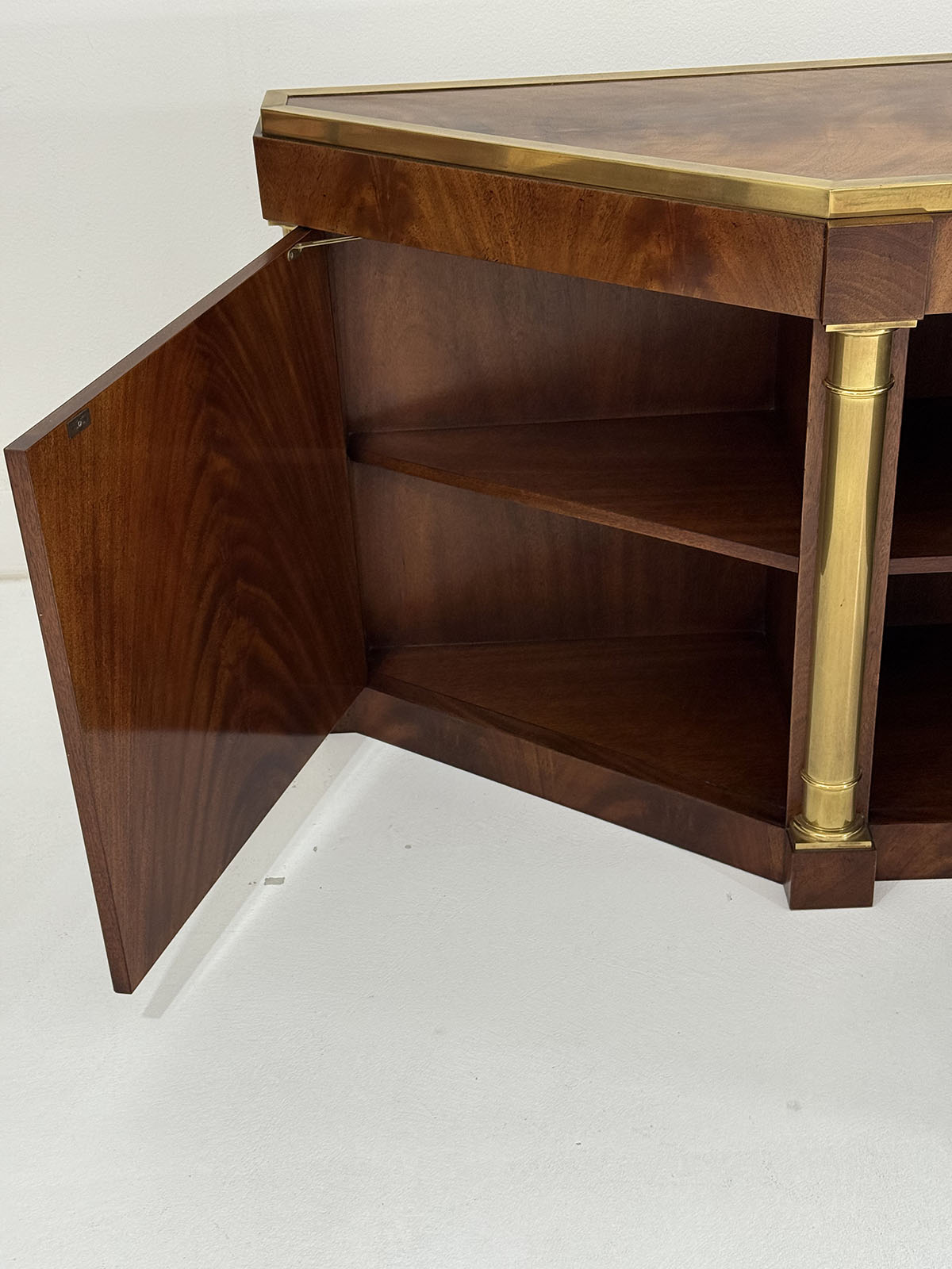 This elegant three-door credenza by Mastercraft of Grand Rapids exemplifies the brand’s reputation for refined craftsmanship and timeless design. The case is crafted from richly grained wood, accented with inset brass trim forming circular motifs on each door and complemented by brass columns at the corners. The top edge is finished with a sleek brass band, enhancing the piece’s architectural presence. The interior features an adjustable shelf in the center and fixed shelves on either side, providing ample concealed storage. Bearing the original Mastercraft brass tag on the back, this piece blends modernist precision with classical detailing, making it a sophisticated addition to both traditional and contemporary interiors.